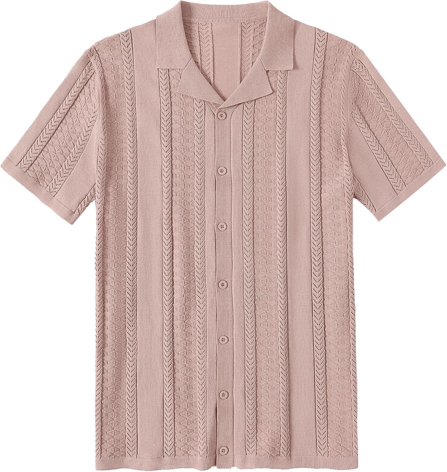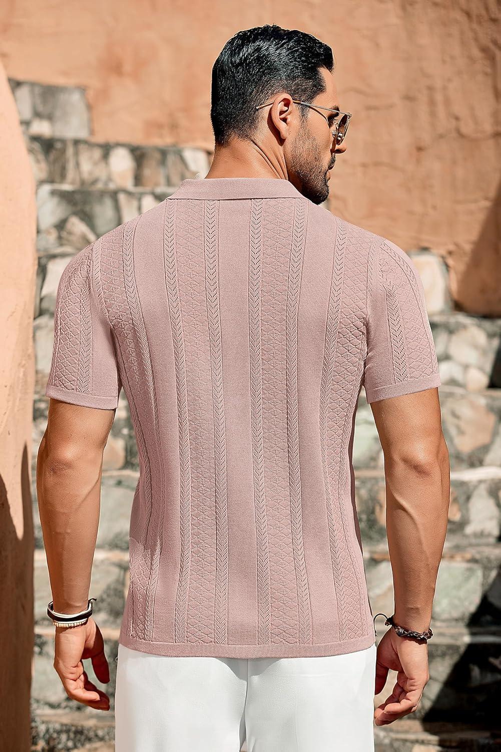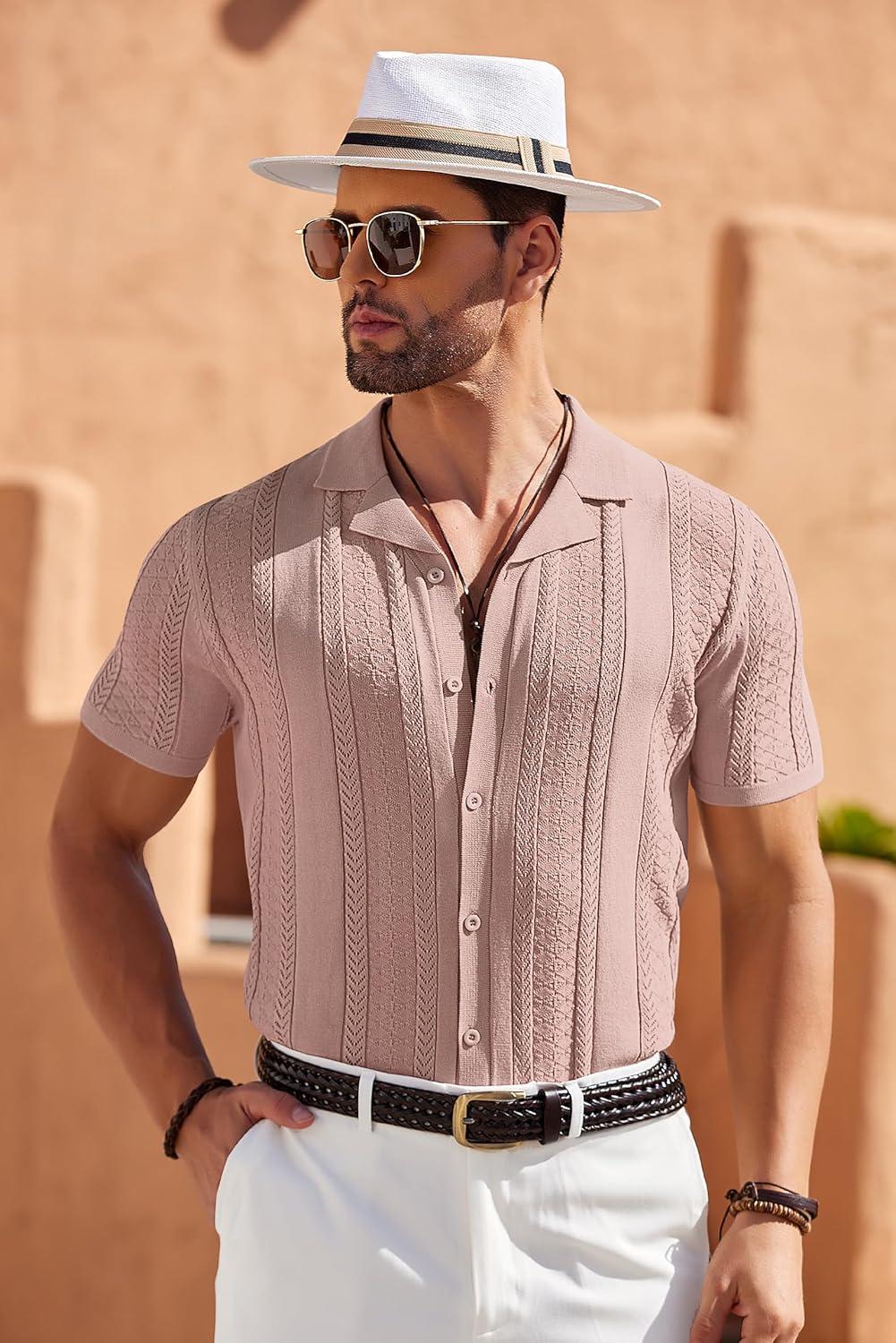COOFANDY Men’s Knit Shirts Short Sleeve Button Down Polo Shirt Fashion Casual Summer Beach Shirts(Pink)