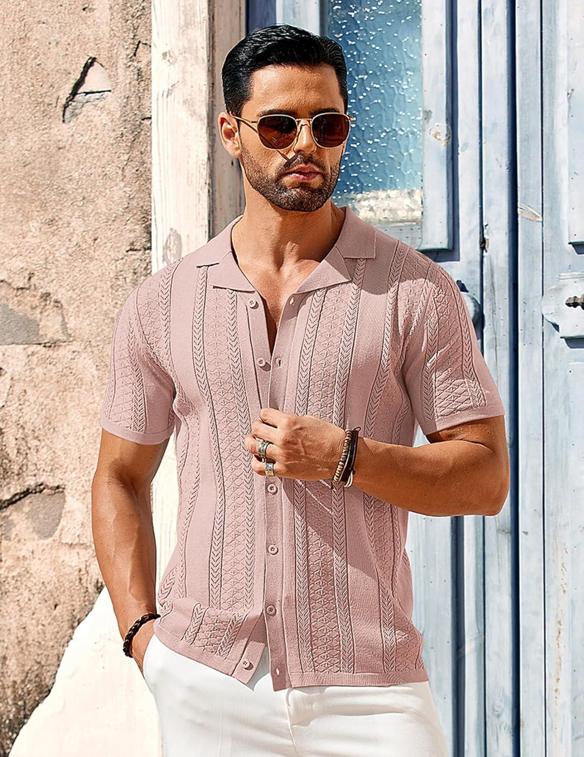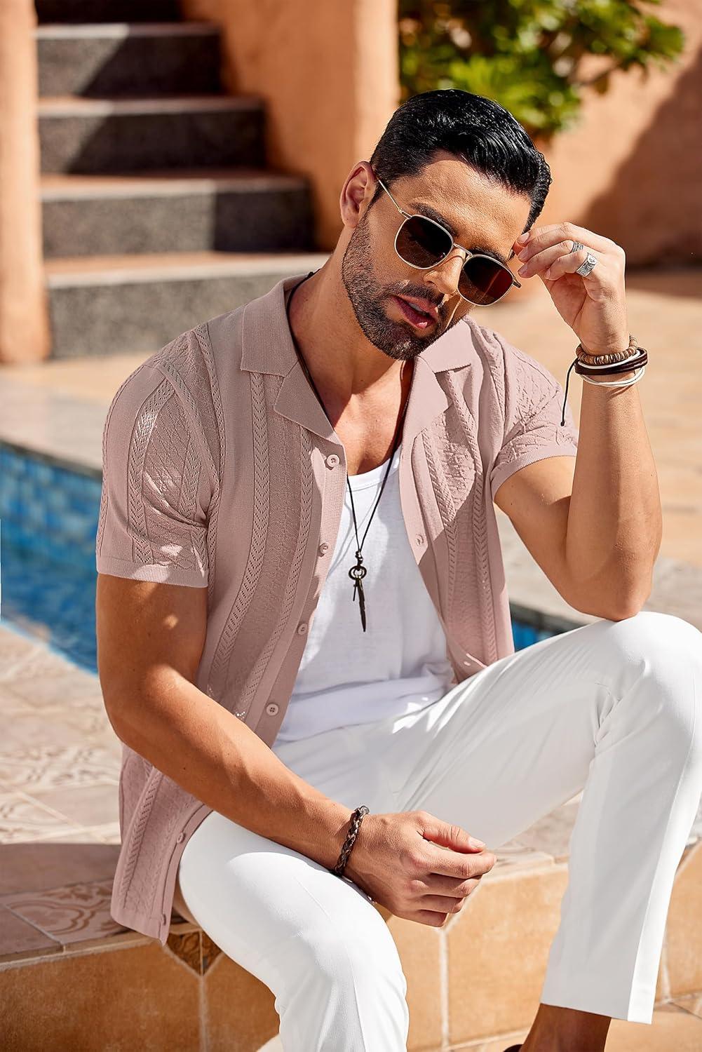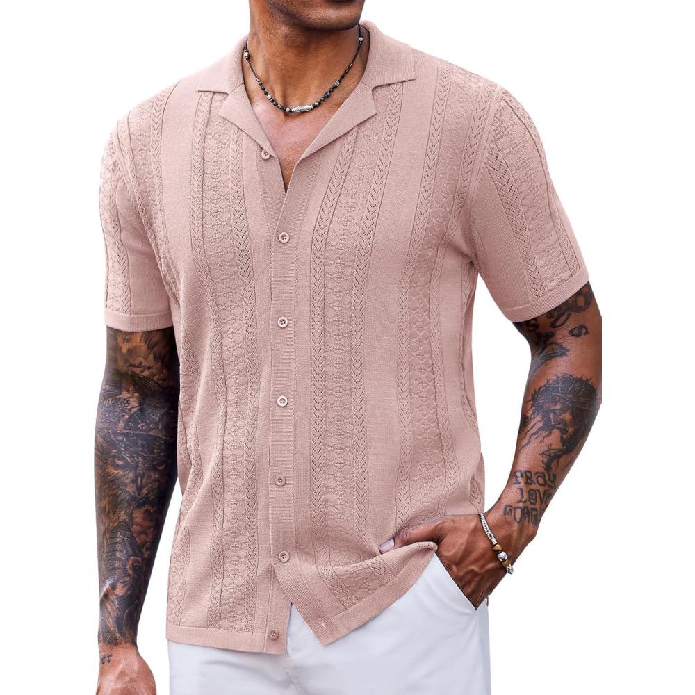 COOFANDY Men’s Knit Shirts Short Sleeve Button Down Polo Shirt Fashion Casual Summer Beach Shirts(Pink)