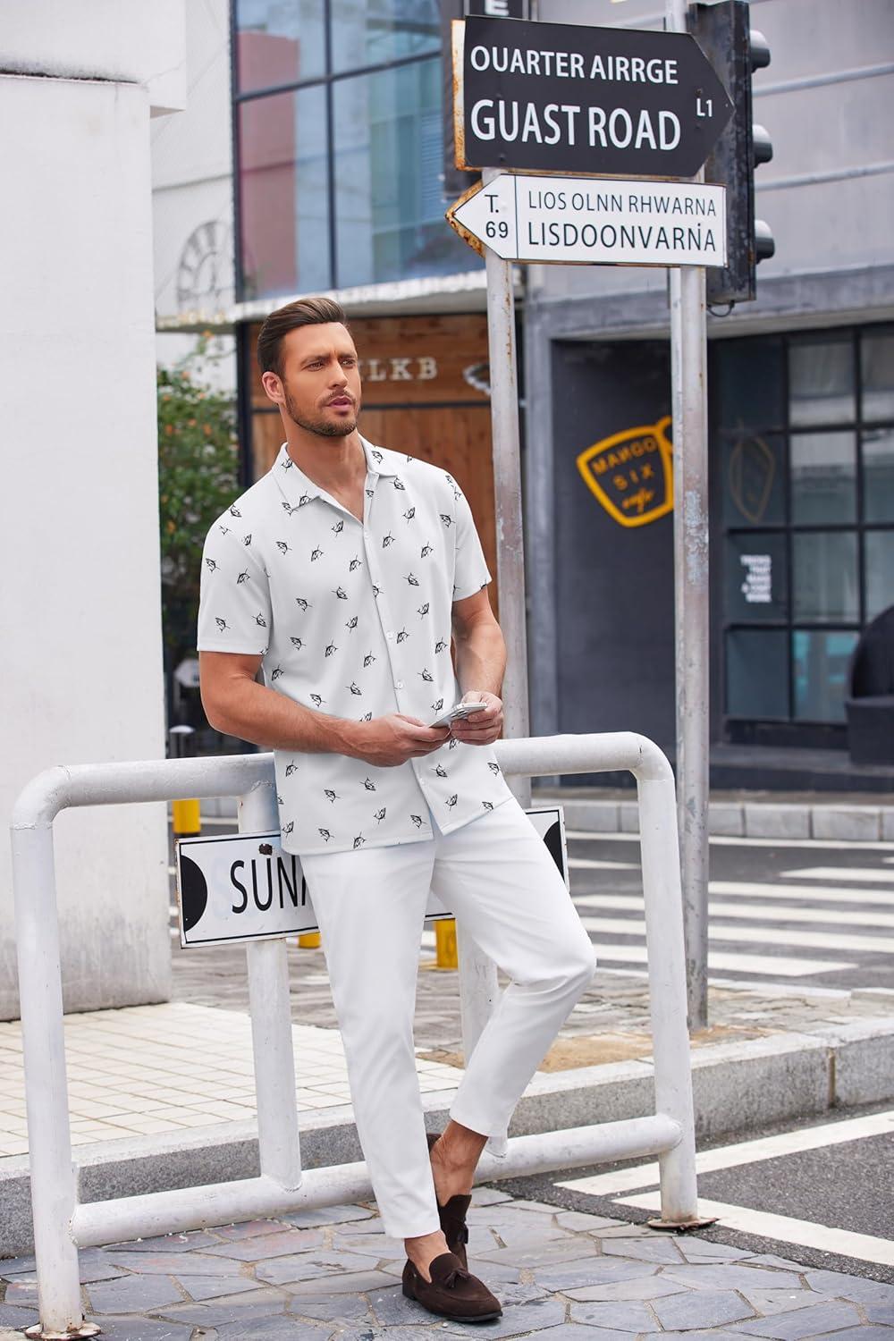 COOFANDY Men’s Knit Shirts Short Sleeve Button Down Polo Shirt Fashion Casual Summer Beach Shirts(White Full Shark)