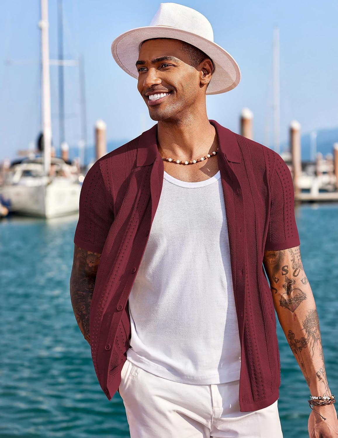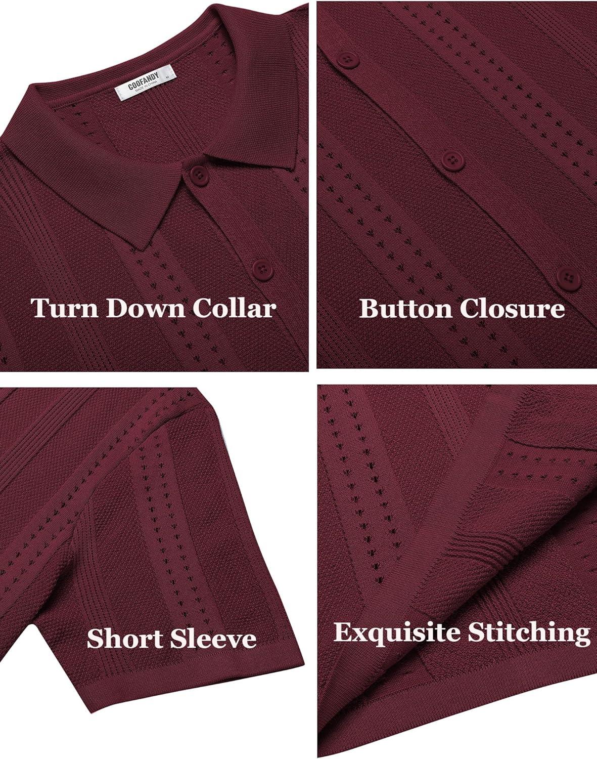 COOFANDY Men’s Knit Shirts Short Sleeve Button Down Polo Shirt Fashion Casual Summer Beach Shirts(Wine Red)