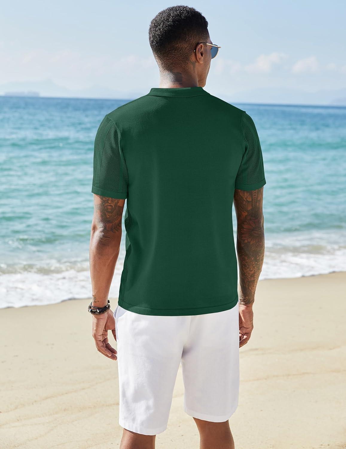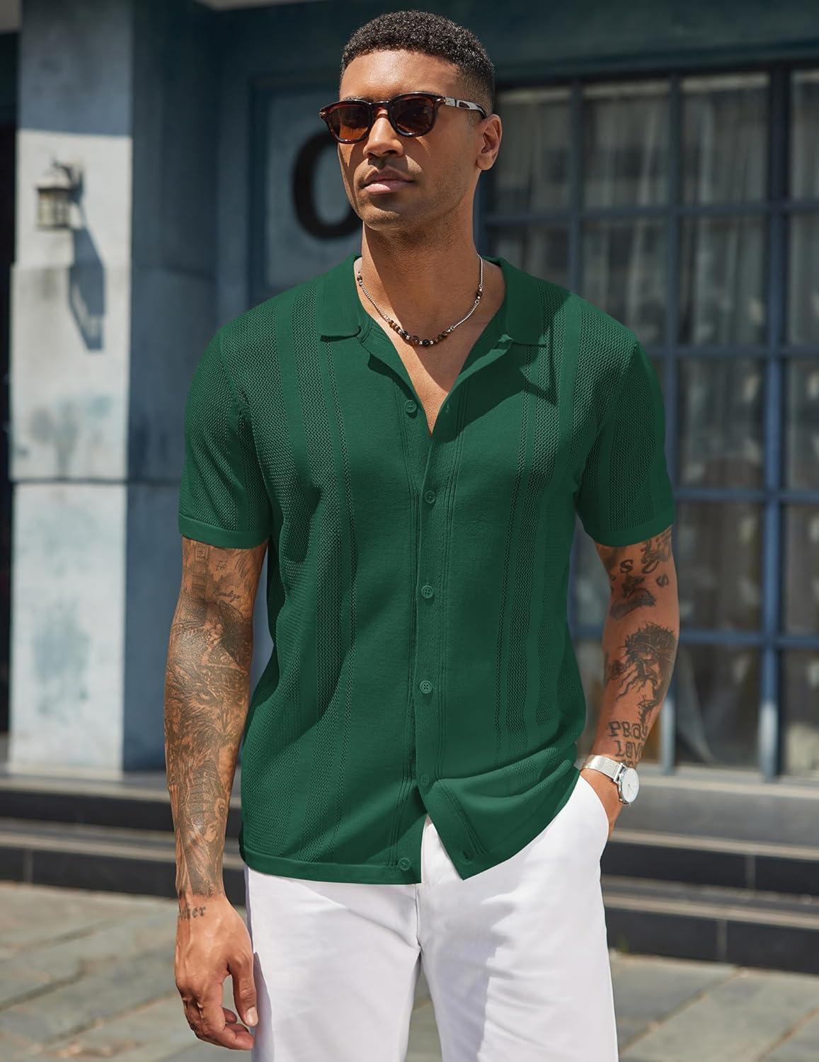 COOFANDY Men’s Knit Shirts Short Sleeve Button Down Polo Shirt Vintage Casual Beach Shirt Summer Tops(Dark Green)