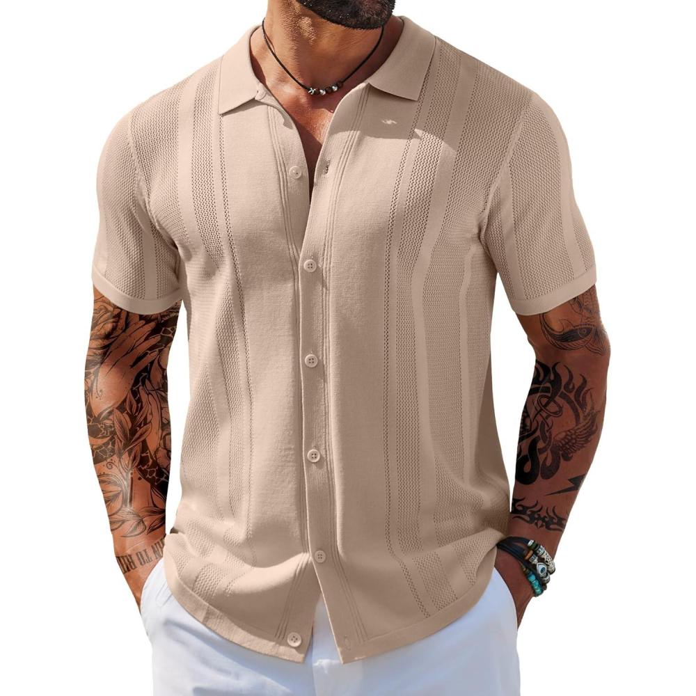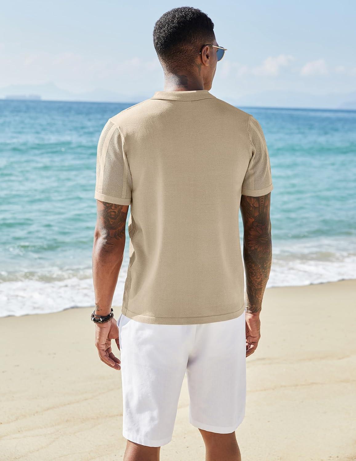 COOFANDY Men’s Knit Shirts Short Sleeve Button Down Polo Shirt Vintage Casual Beach Shirt Summer Tops(Khaki)