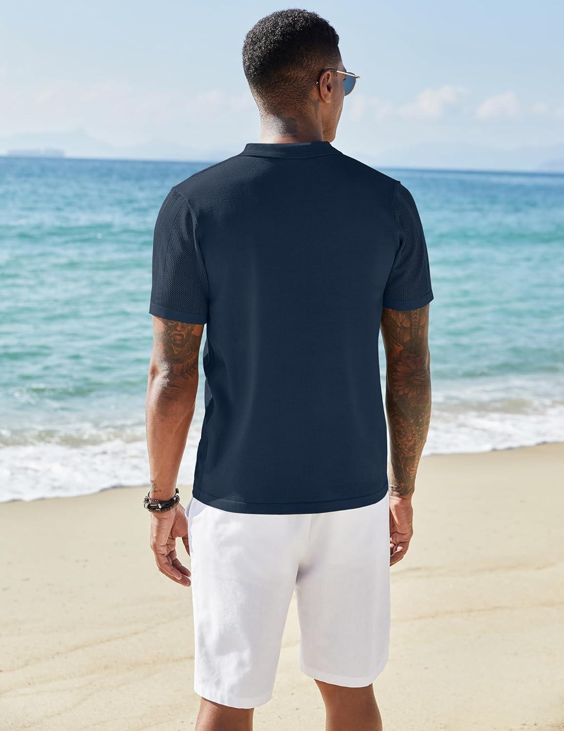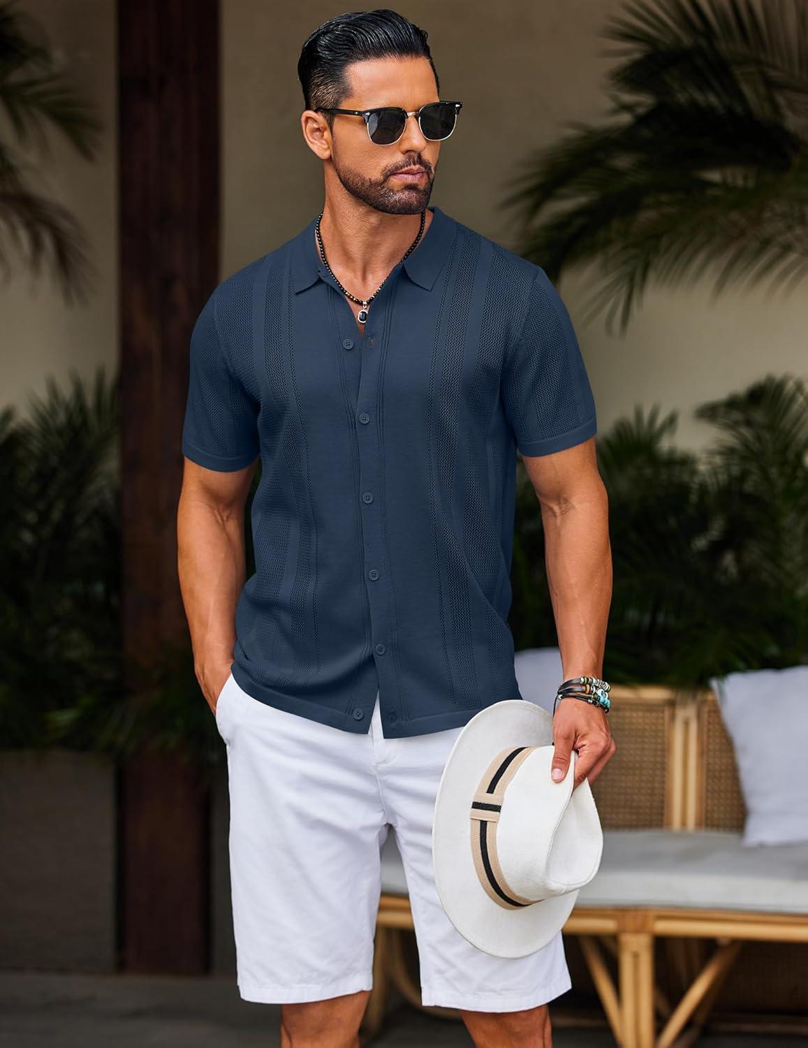COOFANDY Men’s Knit Shirts Short Sleeve Button Down Polo Shirt Vintage Casual Beach Shirt Summer Tops(Navy Blue)
