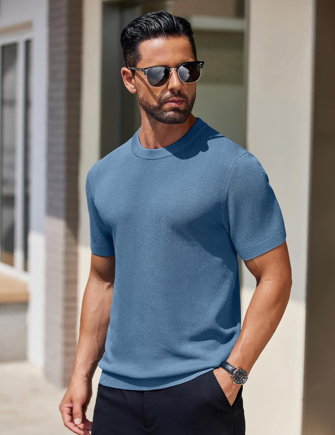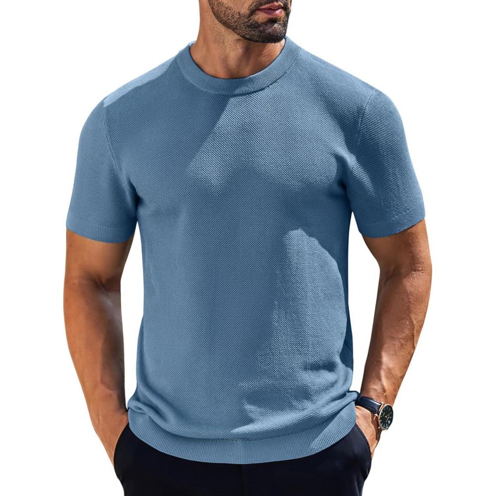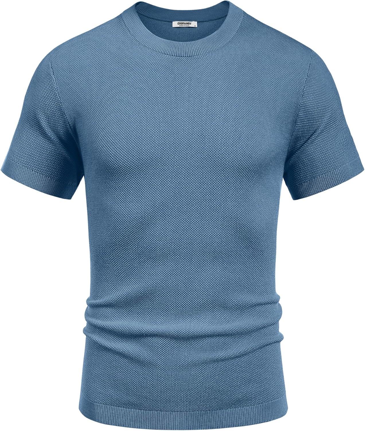 COOFANDY Men’s Knit T-Shirts Short Sleeve Crewneck Shirt Casual Textured Pullover Tees(Gray Blue)