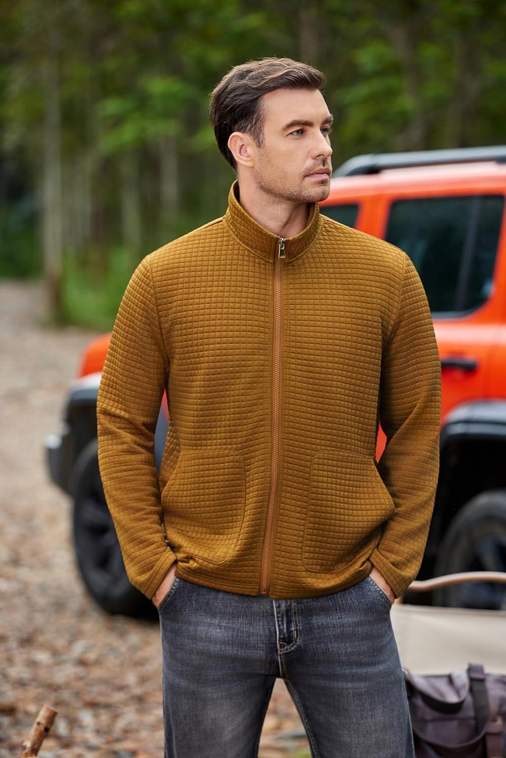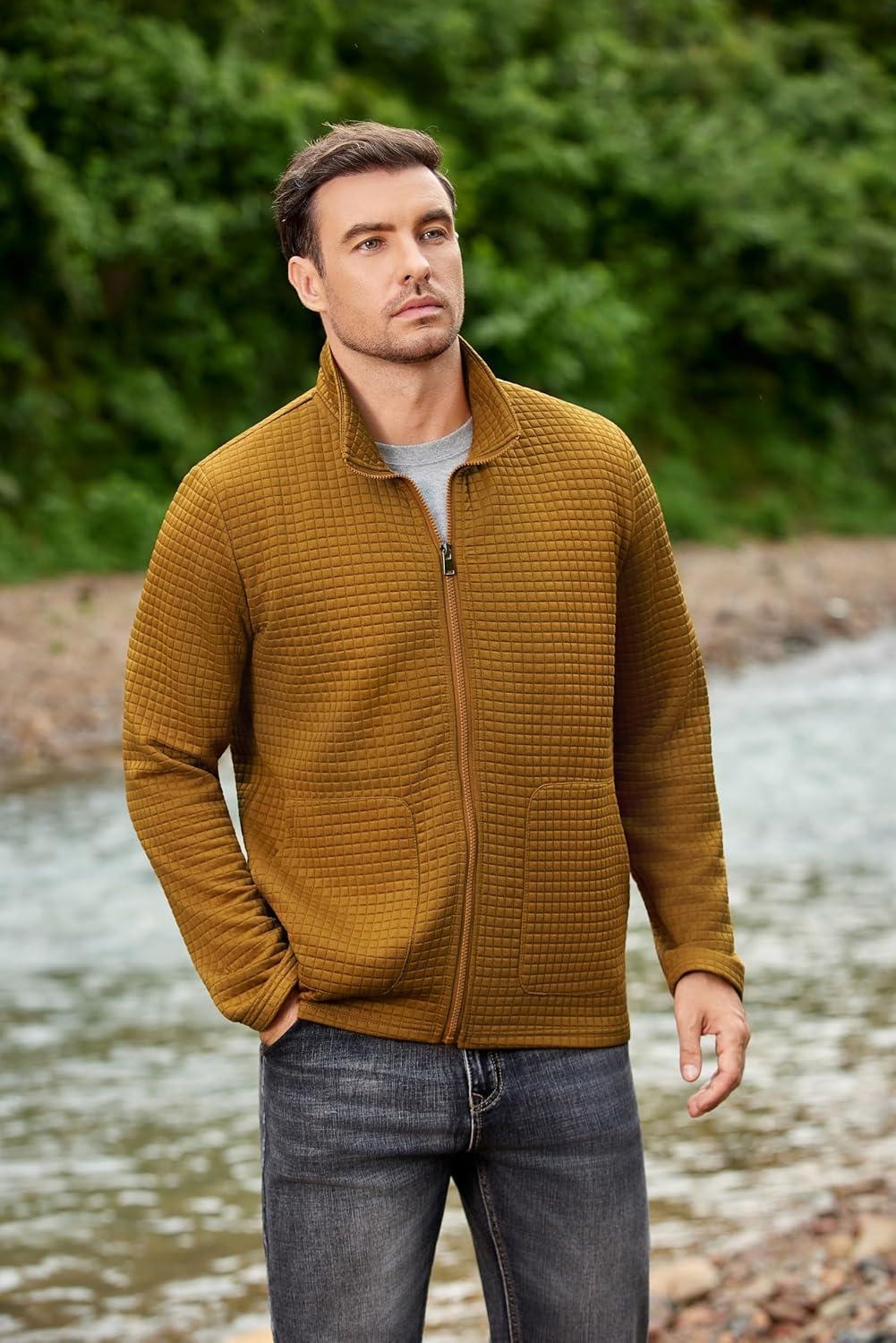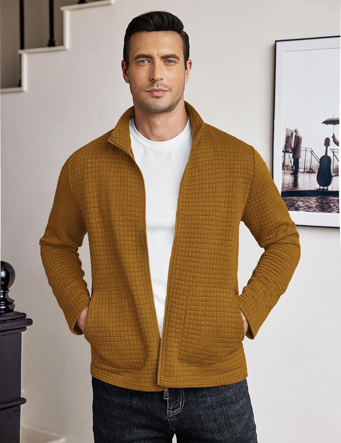 COOFANDY Men’s Lightweight Varsity Jacket Casual Bomber Jackets Waffle Zip Up Sweatshirts with Pocket(Light Brown)