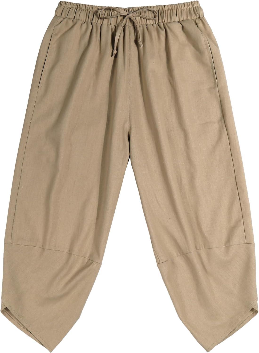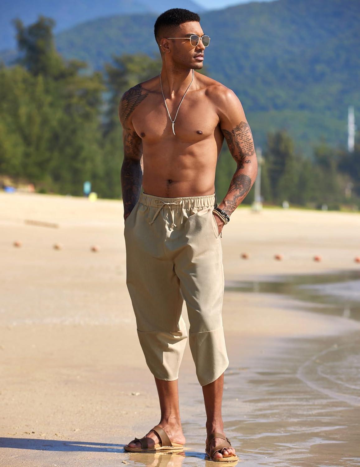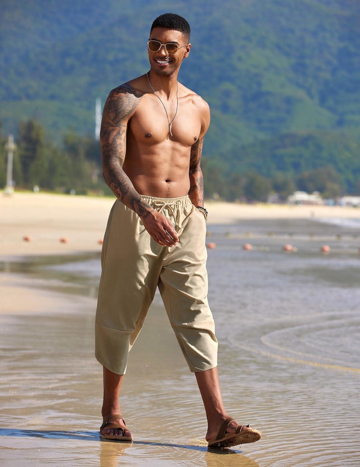 COOFANDY Men’s Linen Harem Capri Pants Lightweight Loose 3/4 Shorts Drawstring Elastic Waist Casual Beach Boho Yoga Trousers(Light Brown)