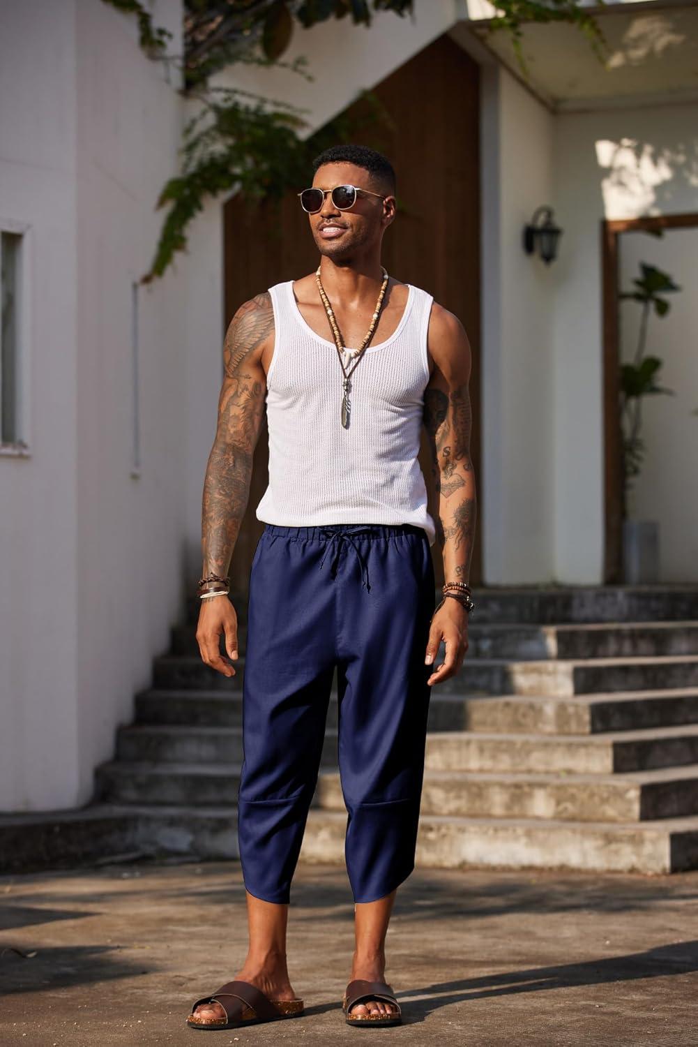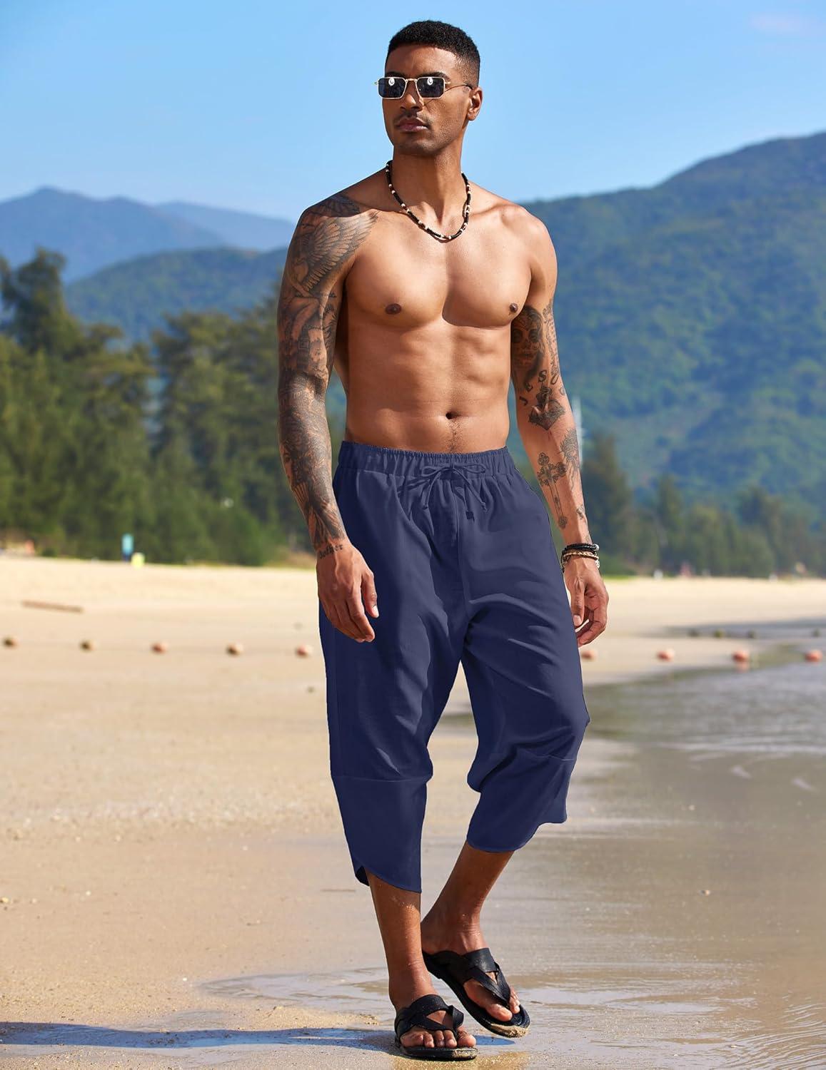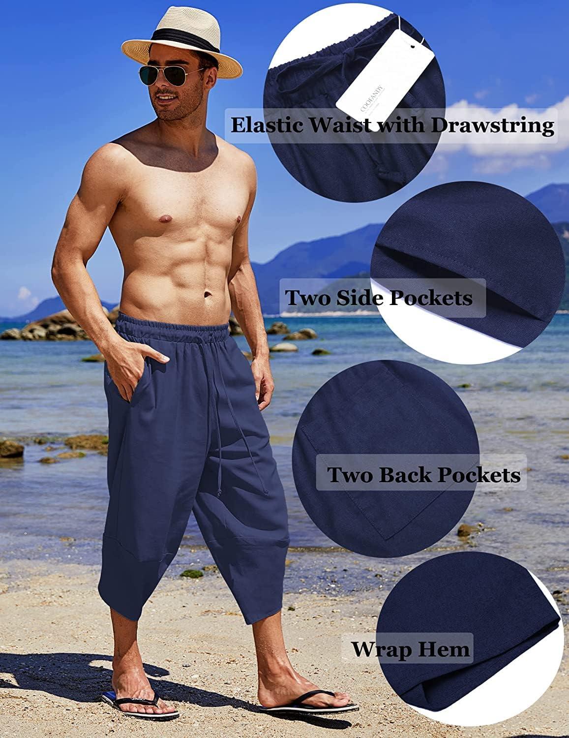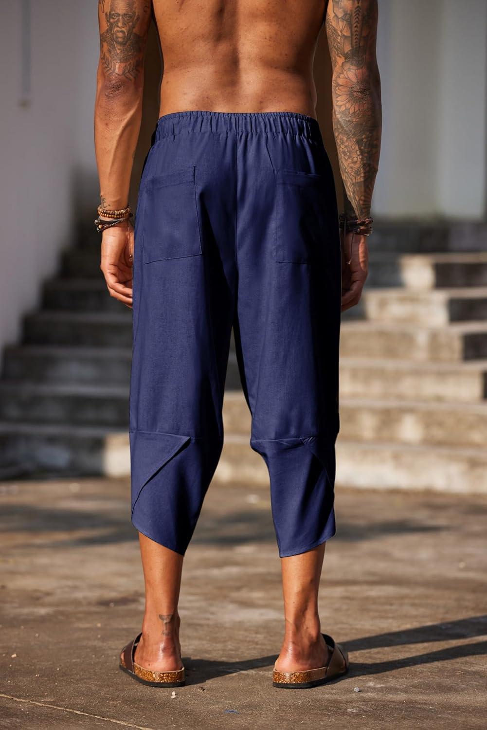COOFANDY Men’s Linen Harem Capri Pants Lightweight Loose 3/4 Shorts Drawstring Elastic Waist Casual Beach Boho Yoga Trousers(Navy Blue)