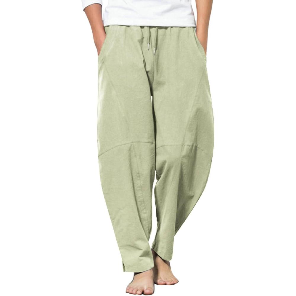 COOFANDY Men’s Linen Harem Drawstring Pants Casual Elastic Waist Lightweight Trouser Hippie Summer Beach Yoga Pants(Light Green)