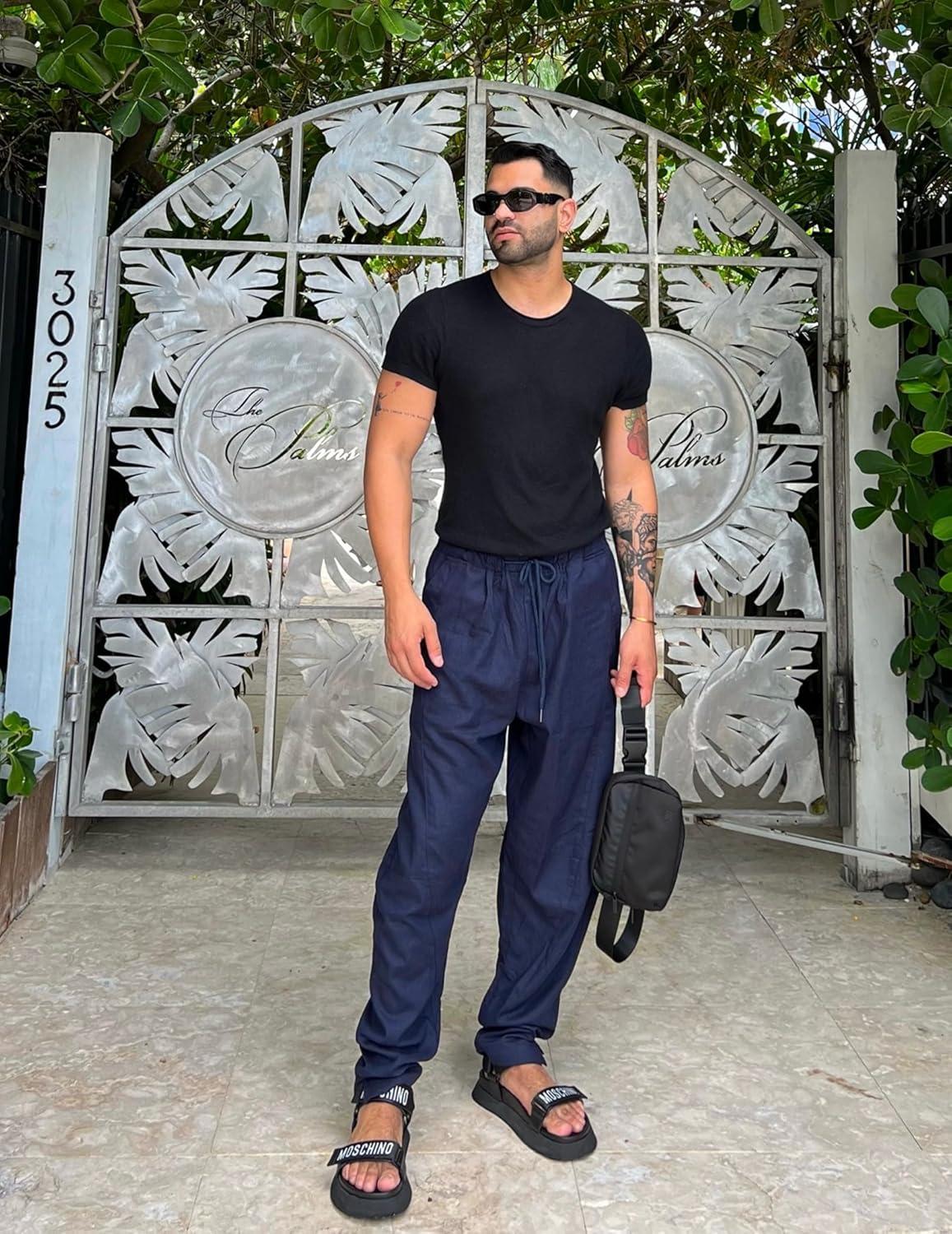 COOFANDY Men’s Linen Harem Drawstring Pants Casual Elastic Waist Lightweight Trouser Hippie Summer Beach Yoga Pants(Navy Blue)