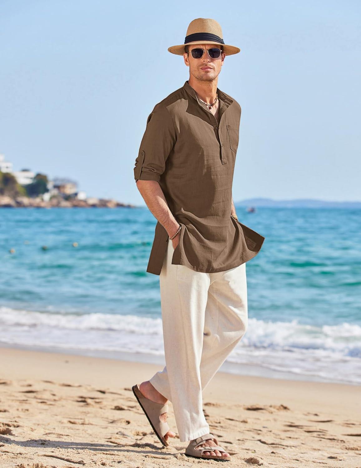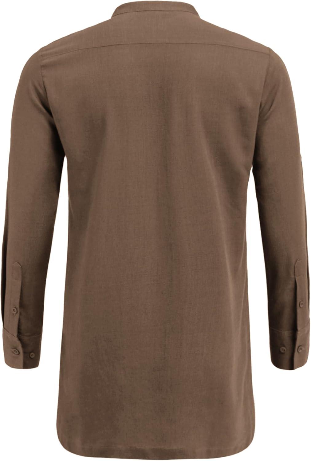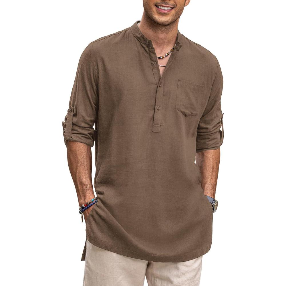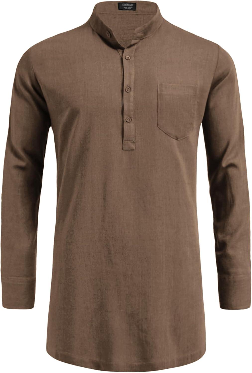 COOFANDY Men’s Linen Henley Shirts Long Sleeve Collarless T-Shirts Longline Kurta Beach Shirts with Pocket(Brown)