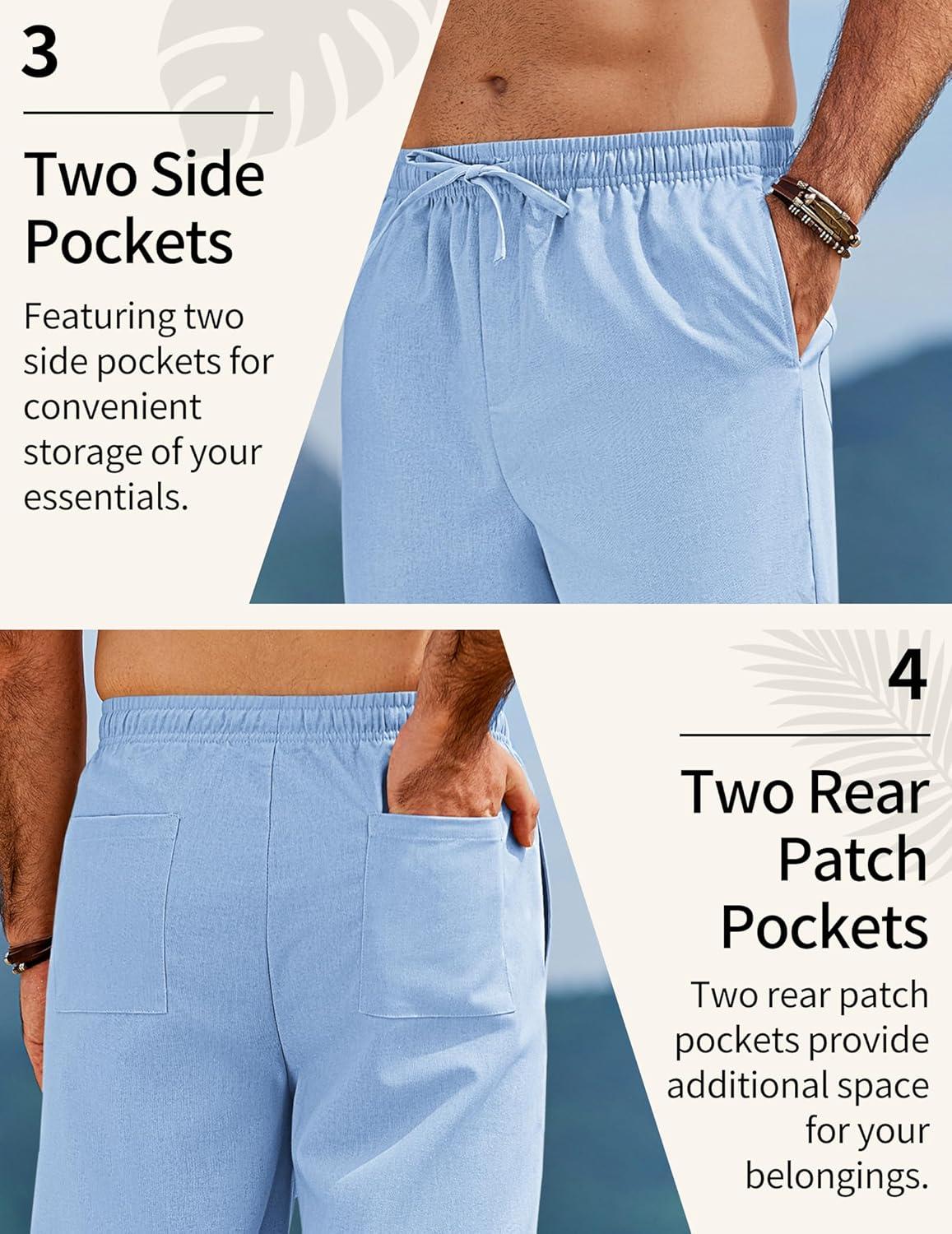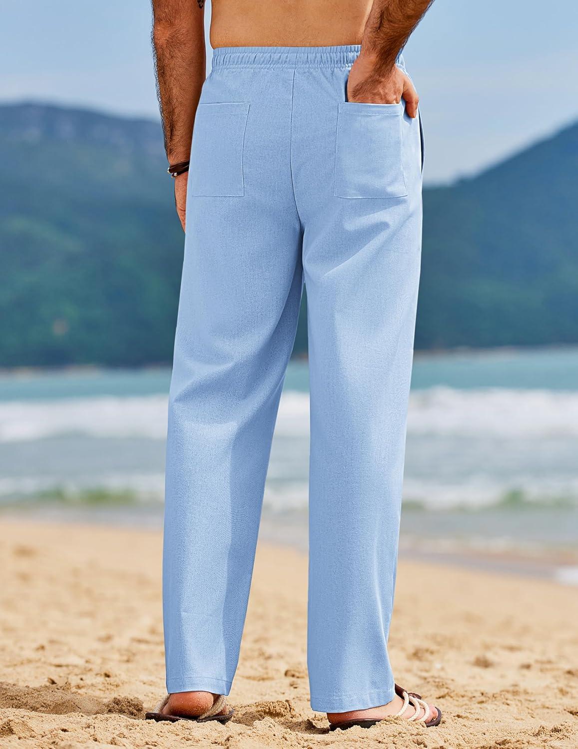 COOFANDY Men’s Linen Pants Casual Loose Fit Beach Summer Yoga Pants Lightweight Drawstring Linen Trousers(Clear Blue)