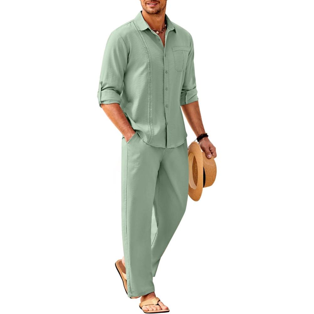 COOFANDY Mens Linen Sets 2 Piece Long Sleeve Button Down Cuban Shirt and Pants Set Summer Beach Set Outfits(Light Green)