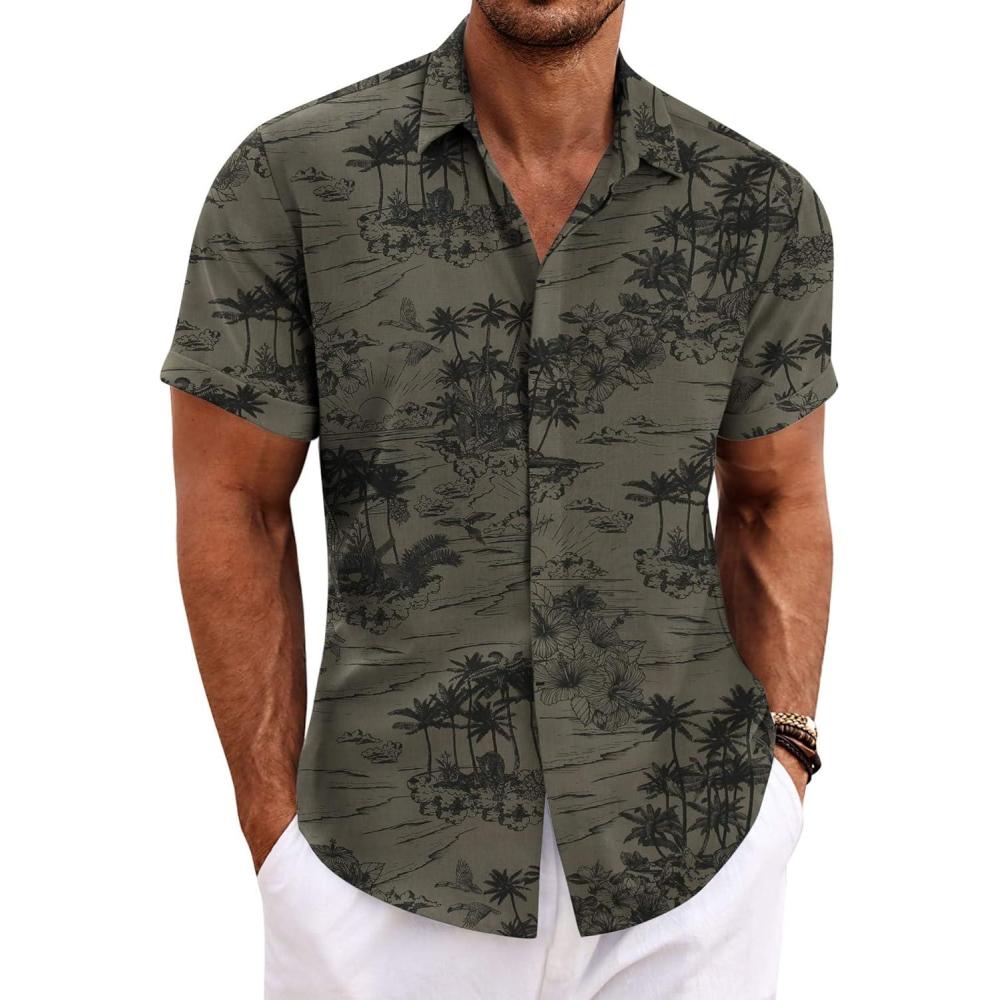 COOFANDY Men’s Linen Shirts Short Sleeve Casual Shirts Button Down Shirt for Men Beach Summer Wedding Shirt(Dark Green Print)