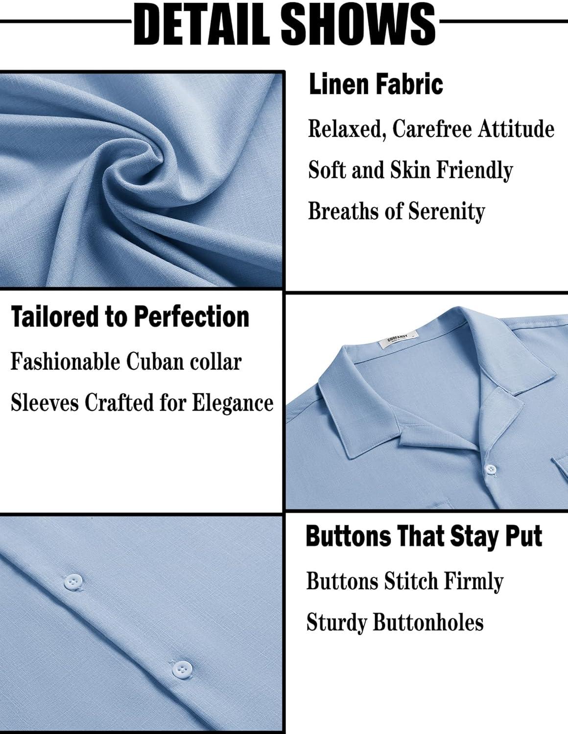 COOFANDY Men’s Linen Short Sleeve Button Down Shirt Casual Cuban Collar Summer Beach Shirts Vacation Essentials(Light Blue)