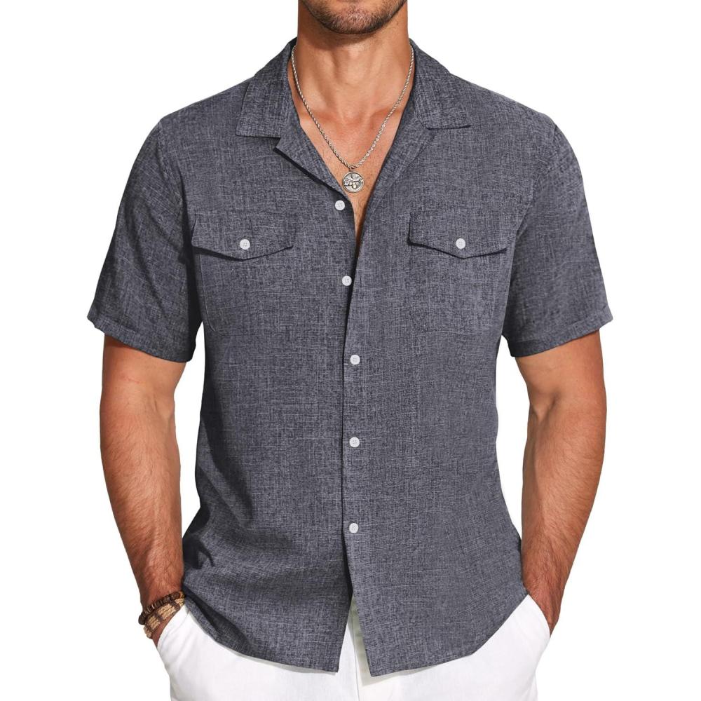COOFANDY Men’s Linen Short Sleeve Button Down Shirt Casual Cuban Collar Summer Beach Shirts Vacation Essentials(Navy Blue)