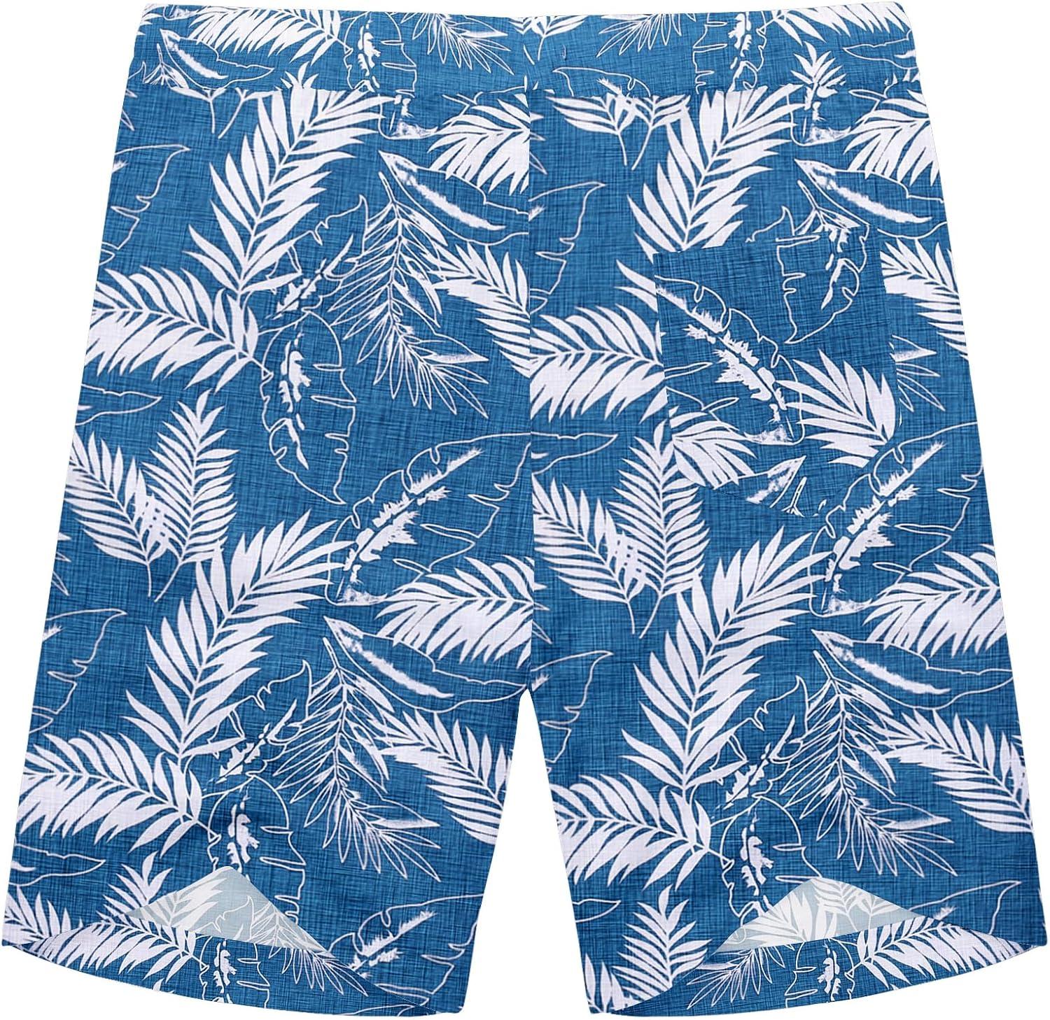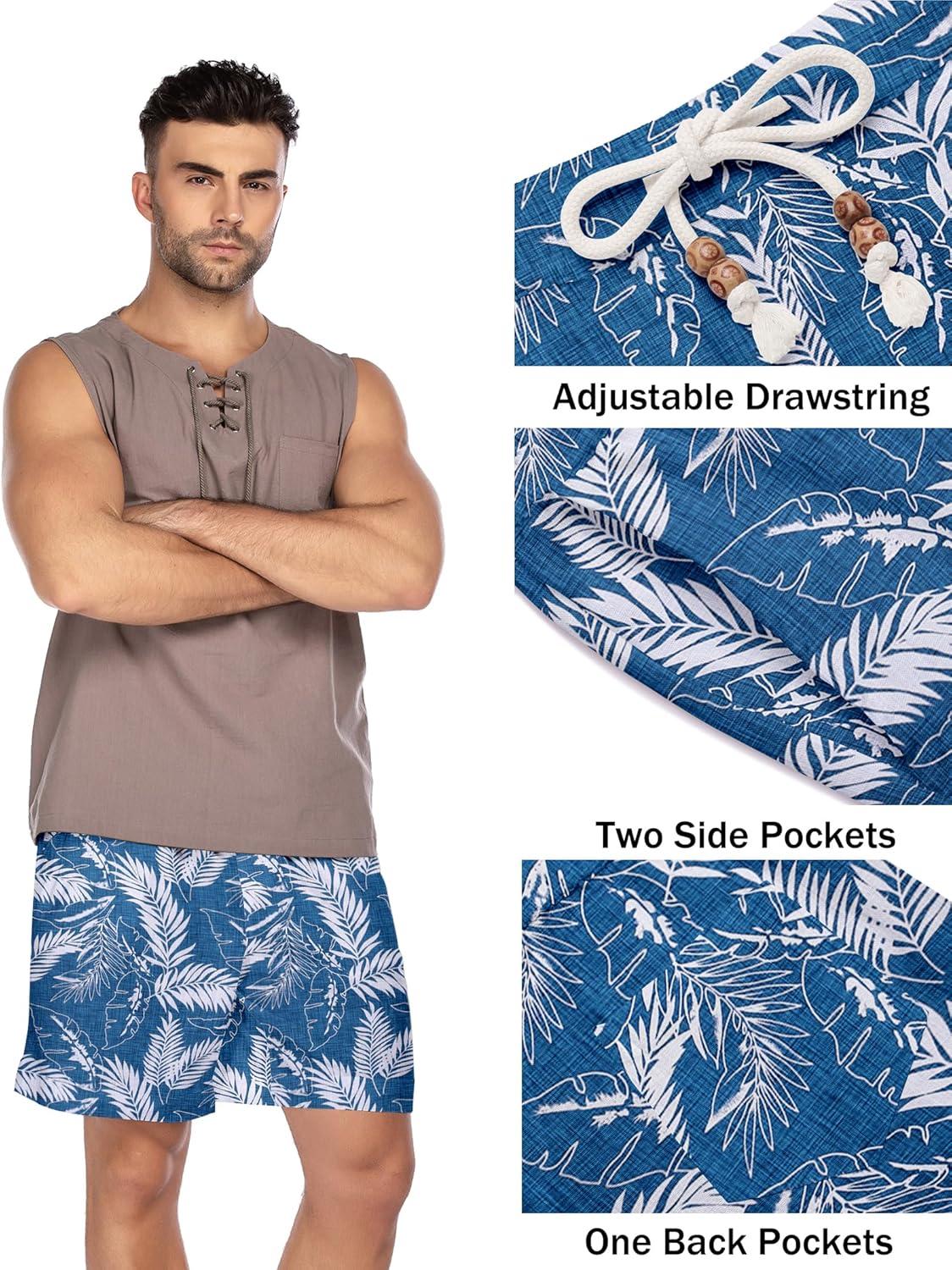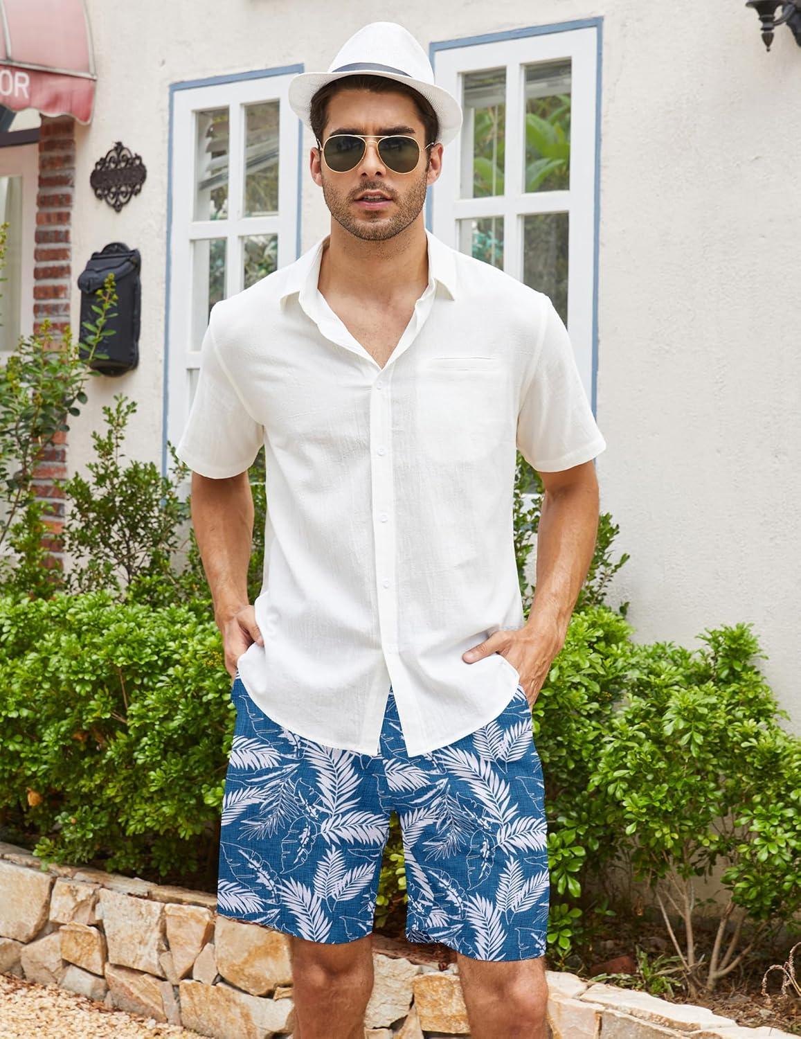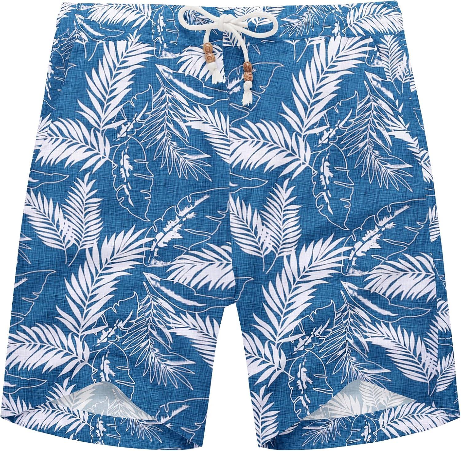 COOFANDY Men’s Linen Shorts Casual Elastic Waist Drawstring Summer Beach Shorts(Blue Palm Leaf)