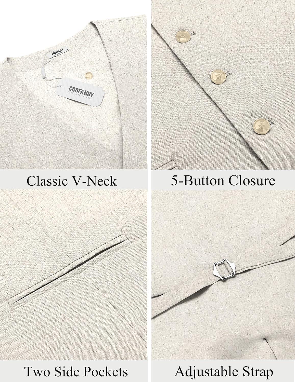 COOFANDY Men’s Linen Vest Casual Linen Slim Fit Suit Vests Dress Waistcoat Wedding Business Prom(Light Khaki)