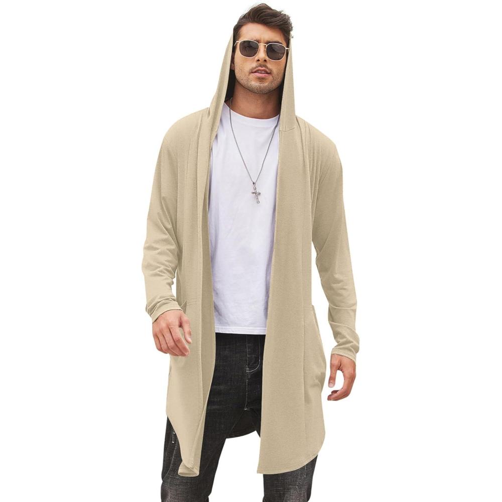 COOFANDY Men’s Long Hooded Cardigan Shawl Collar Lightweight Open Front Drape Cape Overcoat with Pockets(Khaki)
