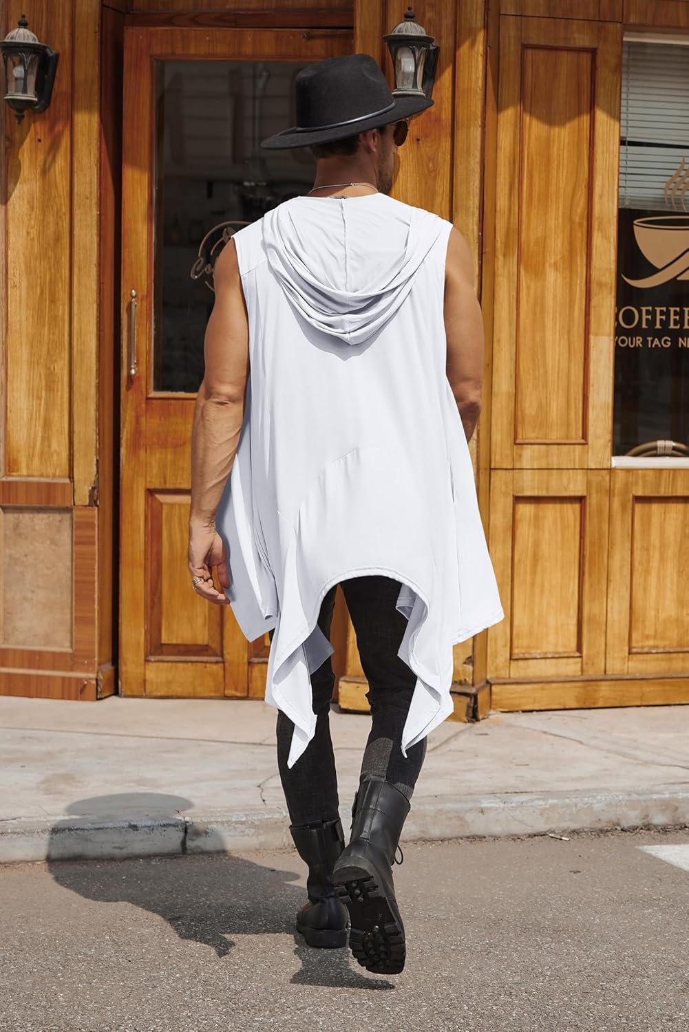 COOFANDY Men’s Long Hooded Cardigan Sleeveless Ruffle Shawl Collar Lightweight Open Front Drape Kimono Vest(White)