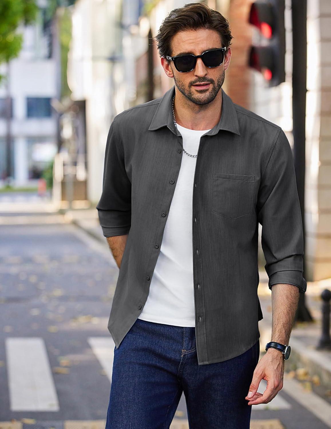 COOFANDY Men’s Long Sleeve Button Down Shirt Wrinkle Free Untucked Dress Shirt Casual Denim Shirt(Dark Grey)