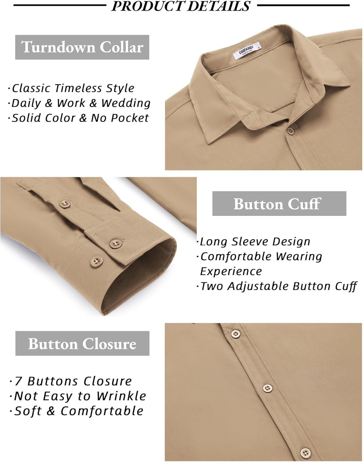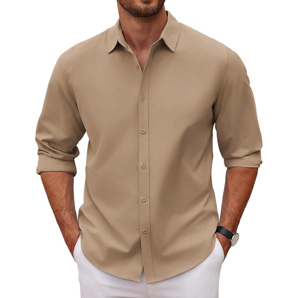COOFANDY Men’s Long Sleeve Button Down Shirts Casual Untucked Dress Shirt Beach Wedding Shirts(Khaki)