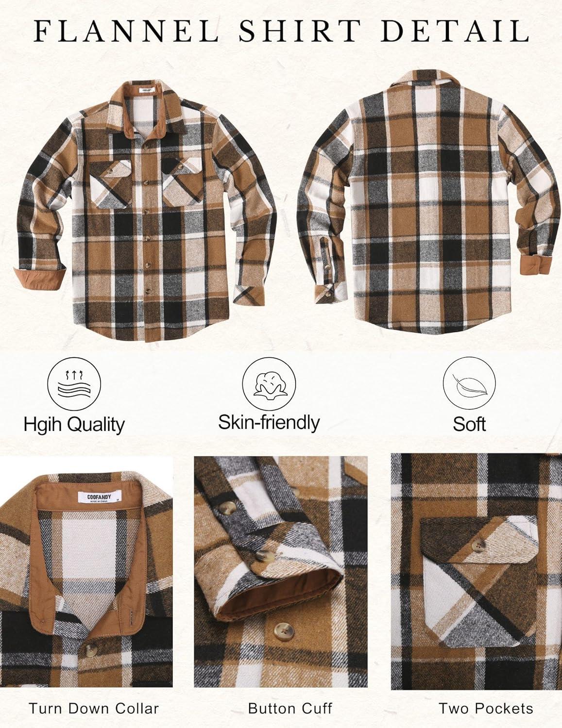 COOFANDY Men’s Long Sleeve Flannel Shirts Jacket Fashion Plaid Jackets Casual Button Down Shirt with Pockets(Khaki-black)