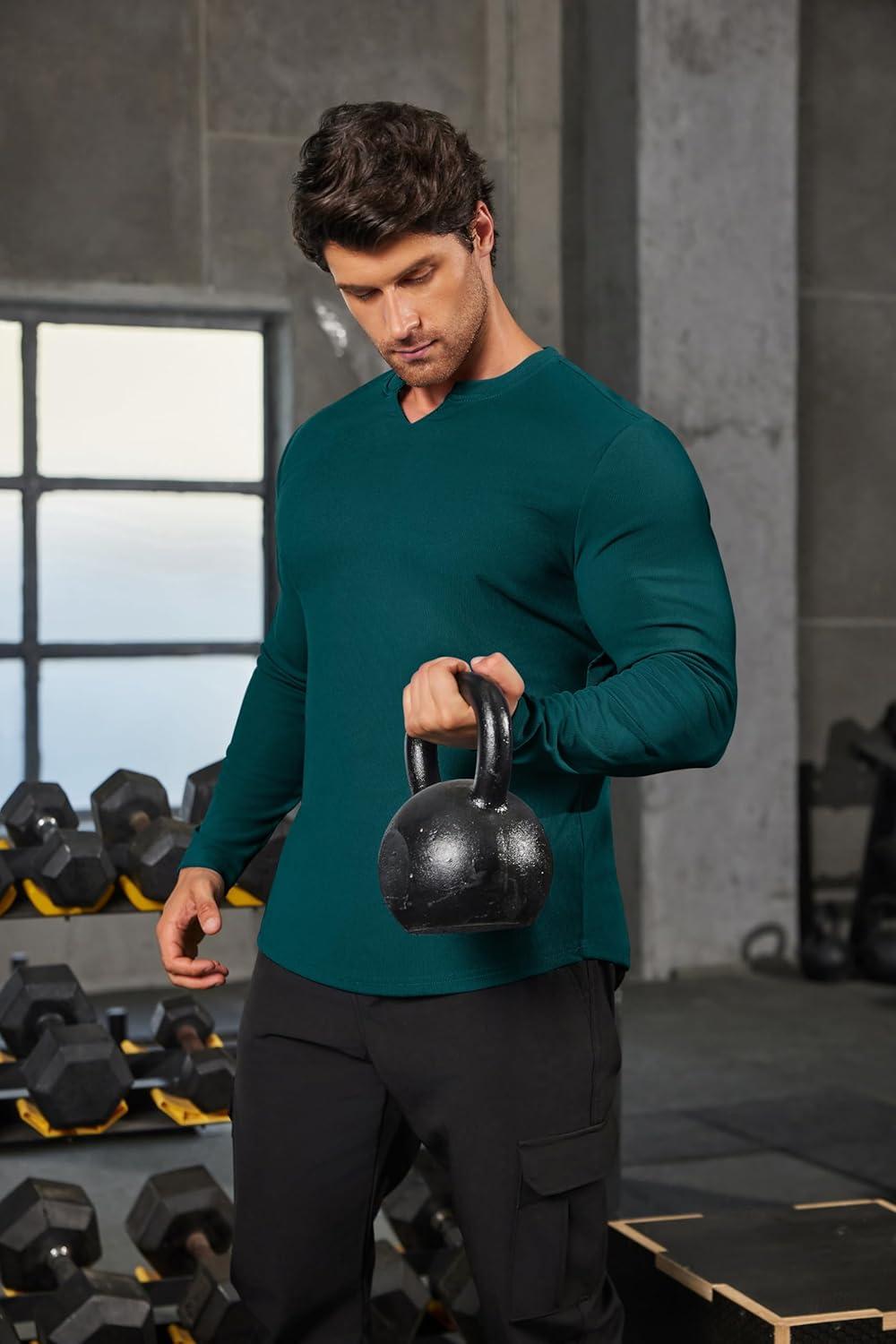 COOFANDY Men’s Long Sleeve Muscle T Shirts Casual V-Neck Slim Fit Longline Ribbed Shirts Stretch Tee Shirts(Green)