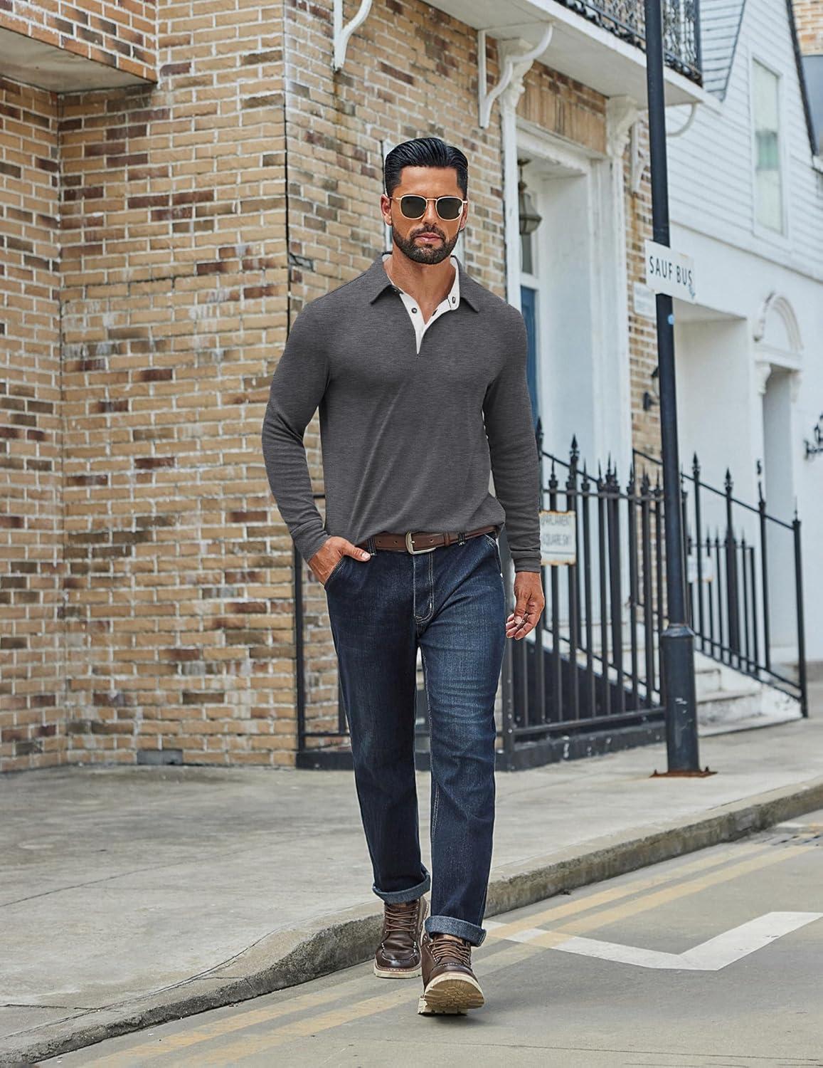 COOFANDY Mens Long Sleeve Polo Shirts Classic Casual Button Polo Tee Lightweight Collared Golf Shirt(Dark Grey)