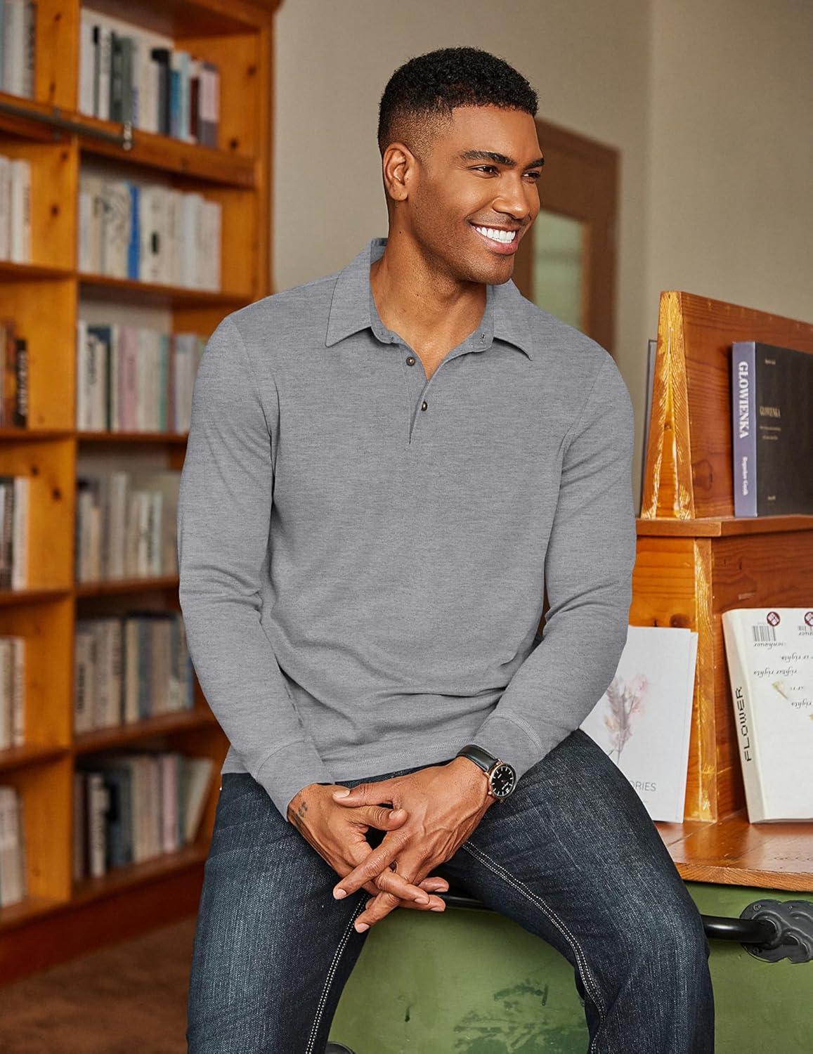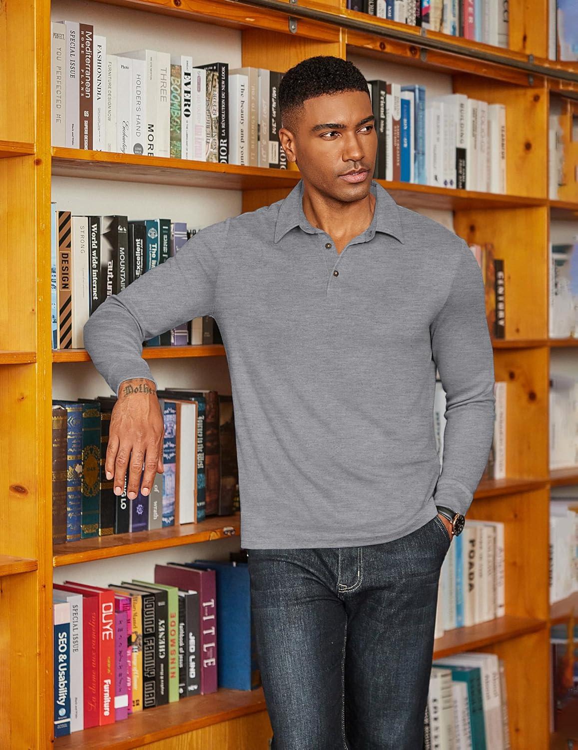 COOFANDY Mens Long Sleeve Polo Shirts Classic Casual Button Polo Tee Lightweight Collared Golf Shirt(Grey)