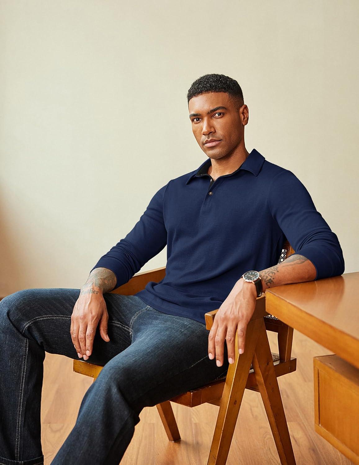 COOFANDY Mens Long Sleeve Polo Shirts Classic Casual Button Polo Tee Lightweight Collared Golf Shirt(Navy Blue)