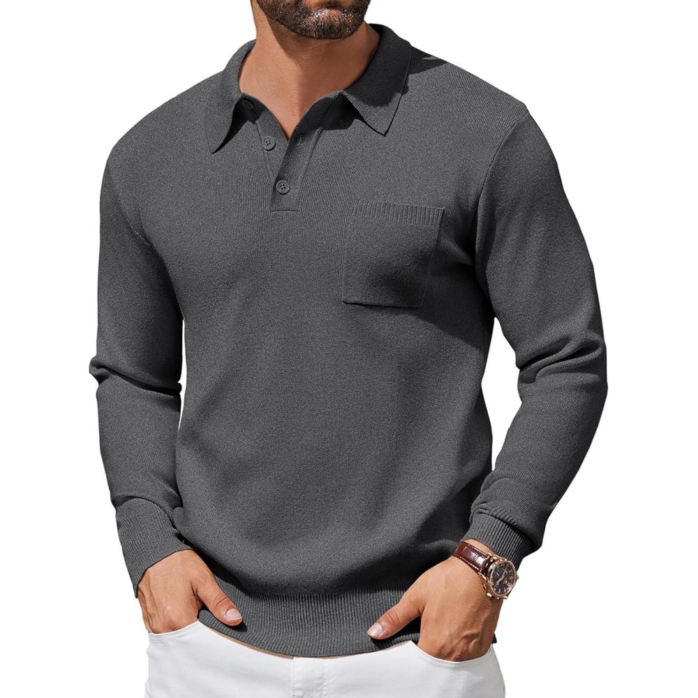 COOFANDY Mens Long Sleeve Polo Sweater Knit Polo Casual Thermal Pullover Sweater with Pocket(Dark Grey)