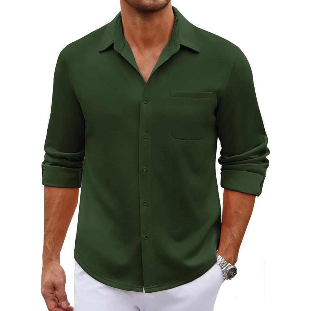 COOFANDY Men’s Long Sleeve Wrinkle Free Shirt Casual Button Down Shirts Stretch Dress Shirt with Pocket(Army Green)