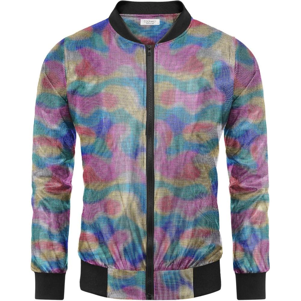 COOFANDY Men’s Metallic Jacket 70s Disco Dance Party Costume Shiny Varsity Zipper Baseball Bomber Jacket(Laser Gold)
