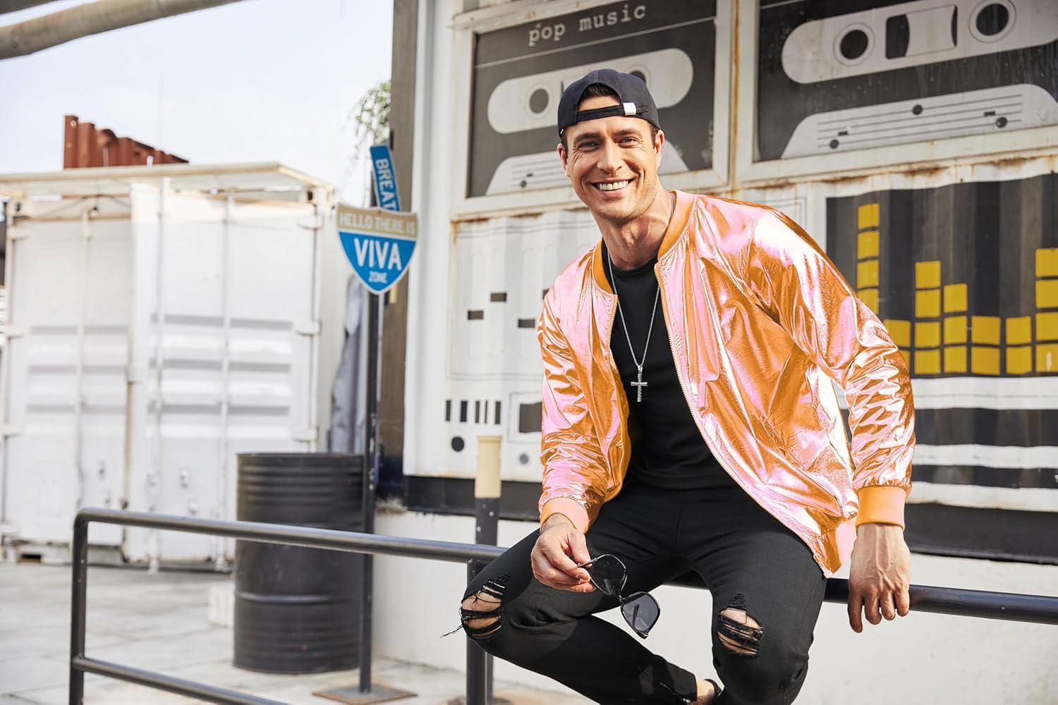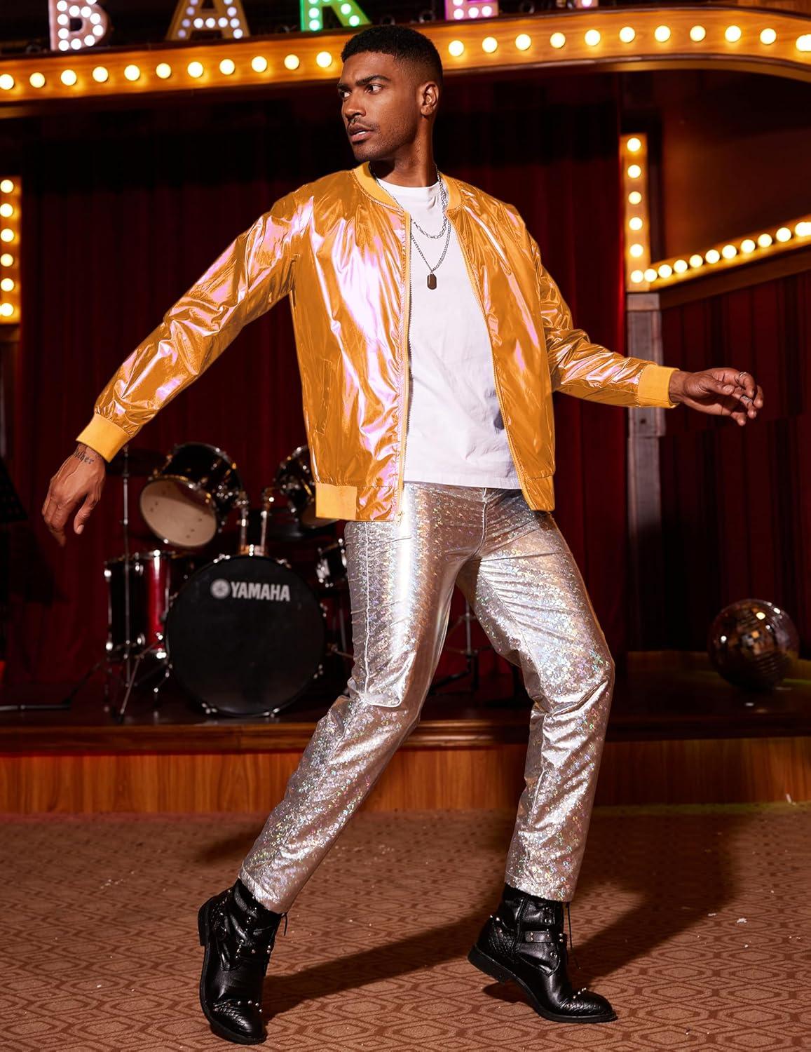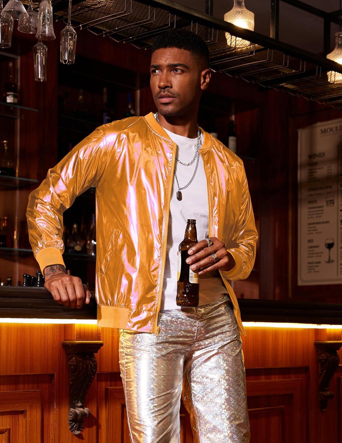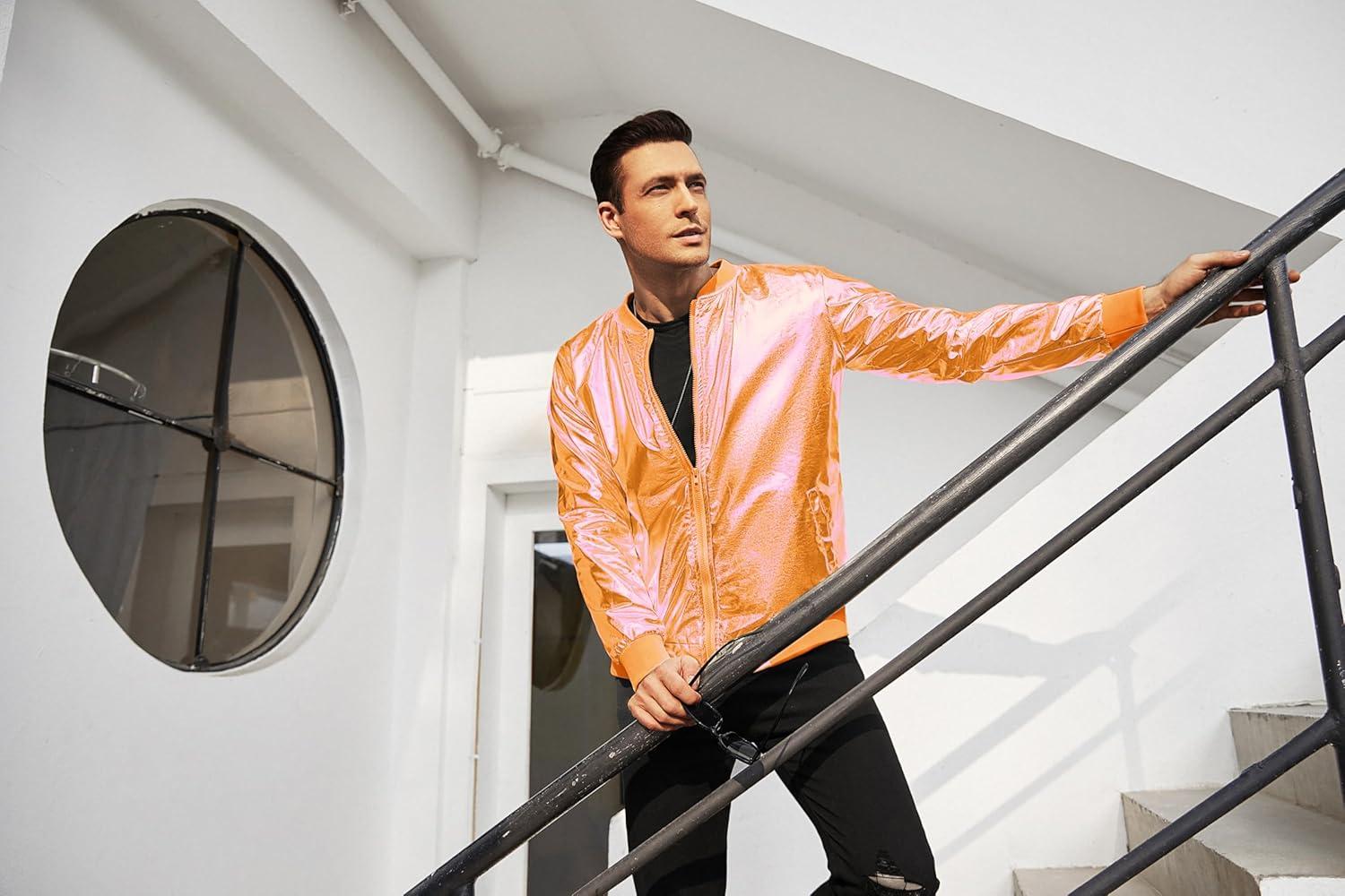 COOFANDY Men’s Metallic Jacket 70s Disco Dance Party Costume Shiny Varsity Zipper Baseball Bomber Jacket(Orange)