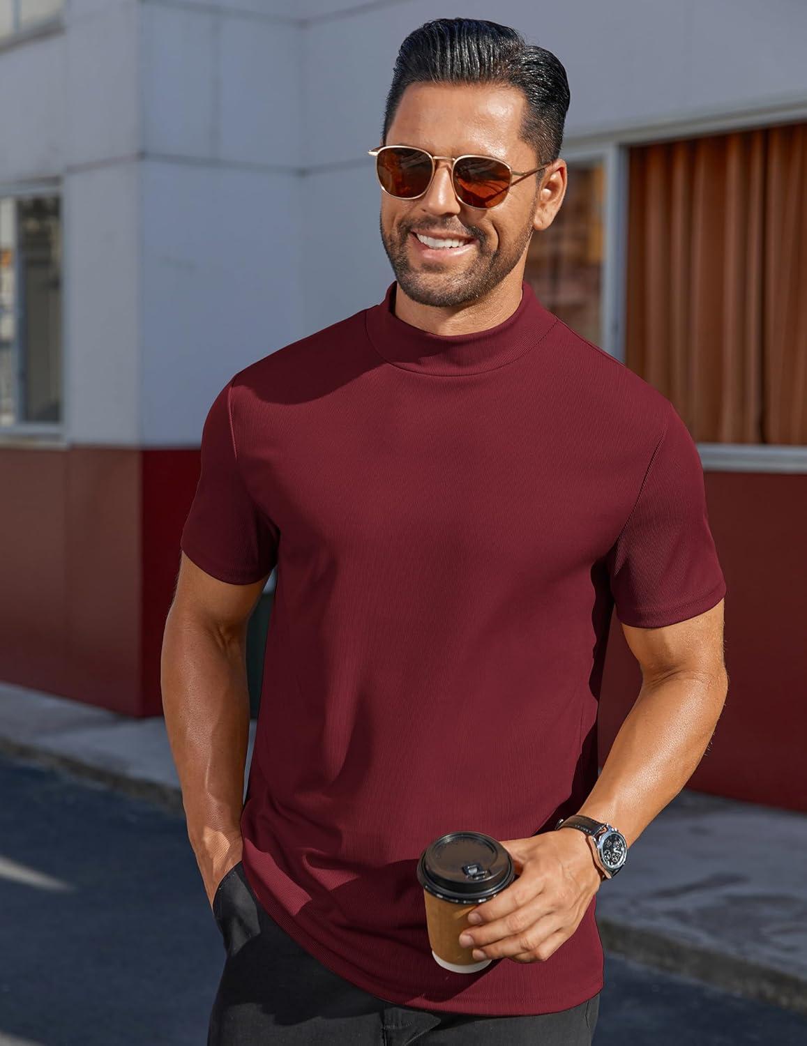 COOFANDY Mens Mock Turtleneck Shirts Short Sleeve Casual Basic T-Shirts Ribbed Solid Pullover Tops(Wine Red)