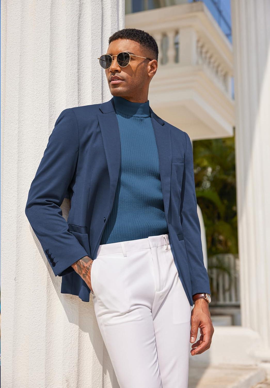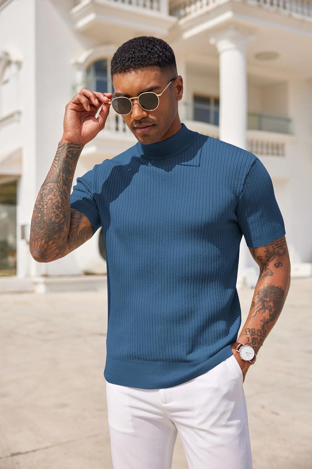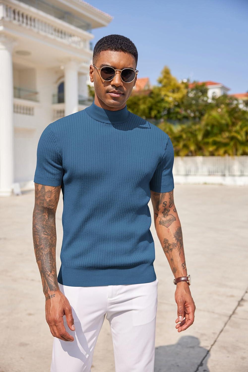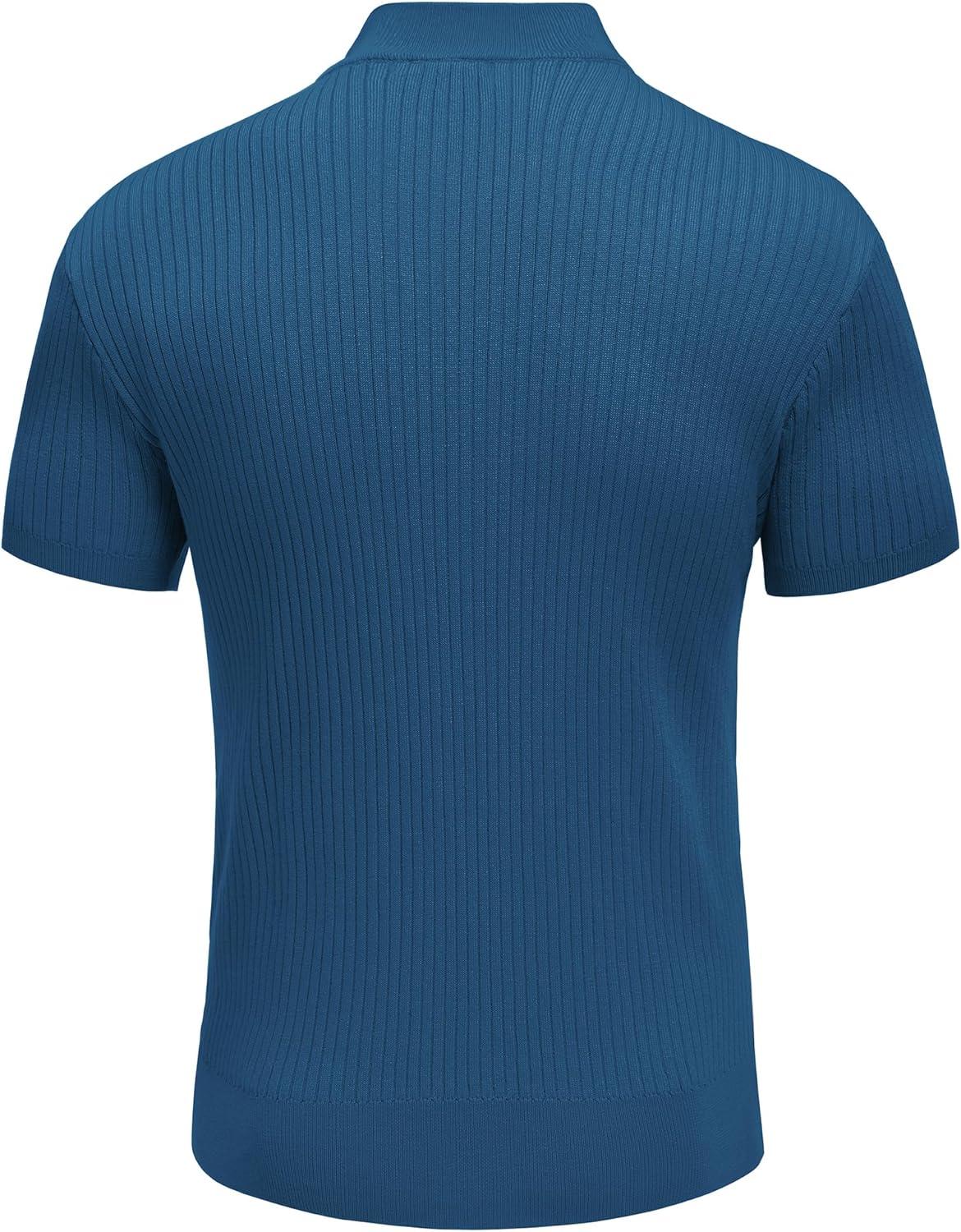 COOFANDY Men’s Mock Turtleneck Sweater Short Sleeve Casual Basic Tops Ribbed Knit Pullover Solid Tee(Dark Blue)
