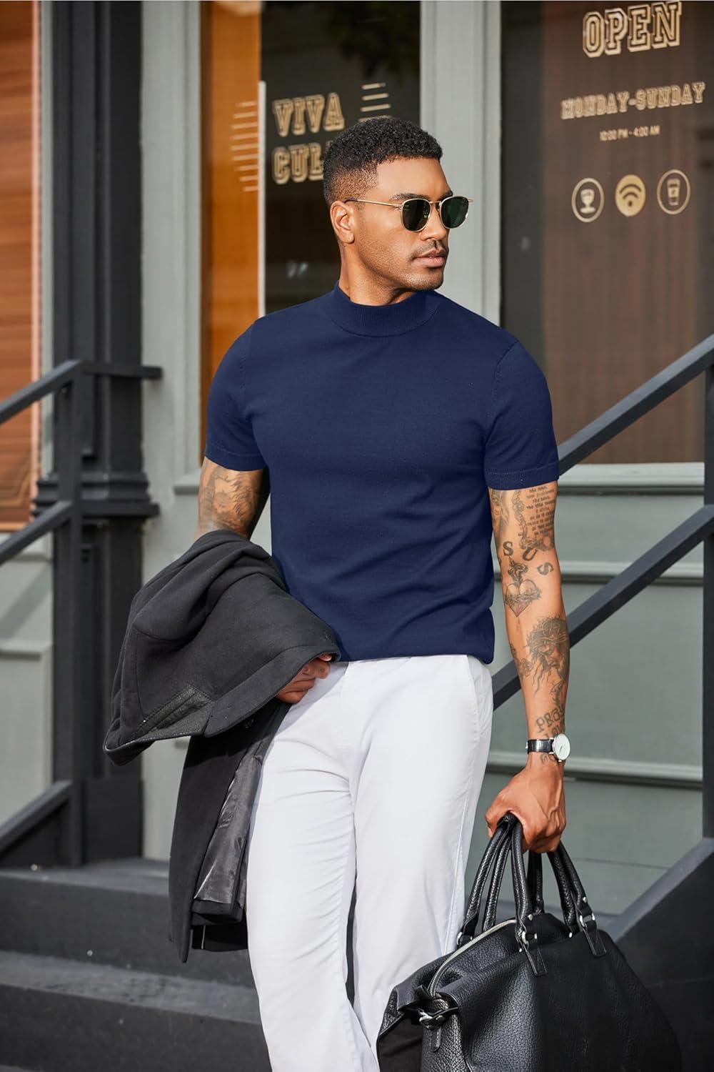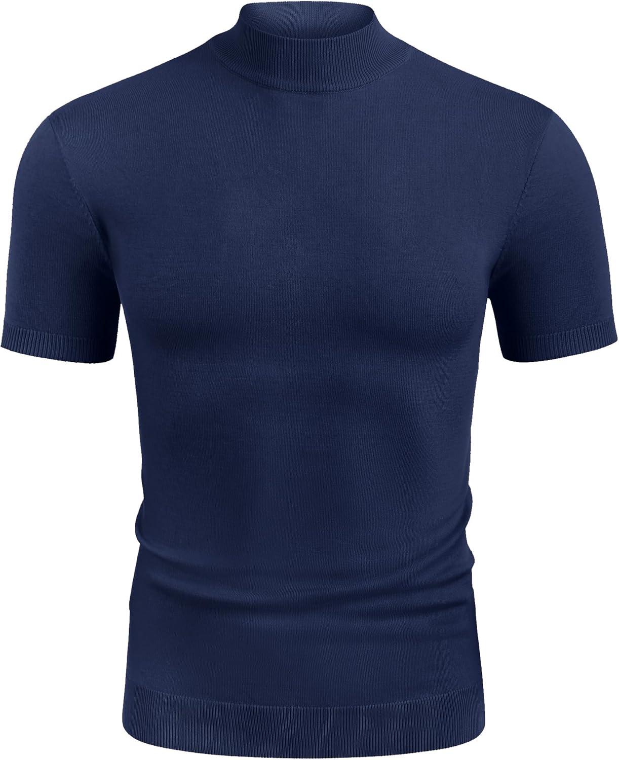 COOFANDY Mens Mock Turtleneck Sweater Short Sleeve Casual Dress Sweater Slim Fit Pullover Basic Knit Tee(Navy Blue)