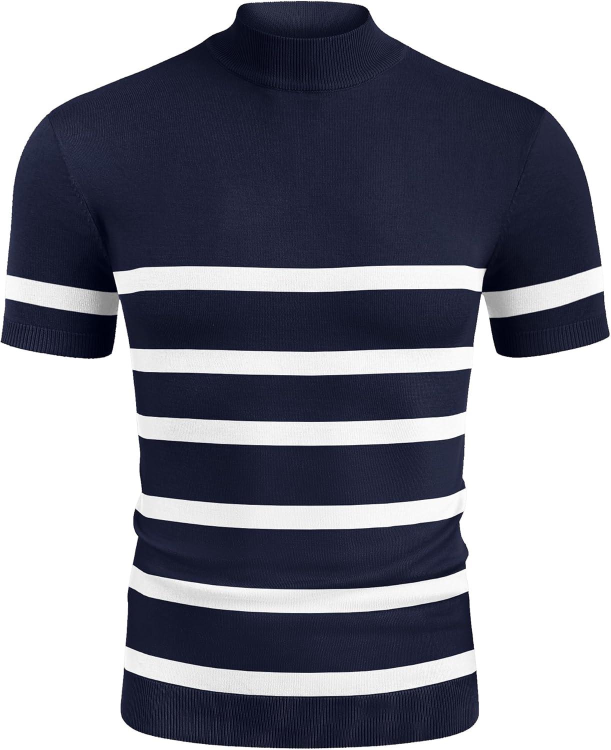COOFANDY Mens Mock Turtleneck Sweater Short Sleeve Casual Dress Sweater Slim Fit Pullover Basic Knit Tee(Navy Stripe)