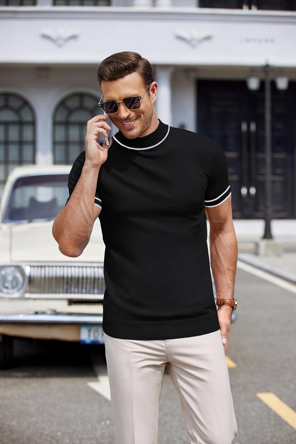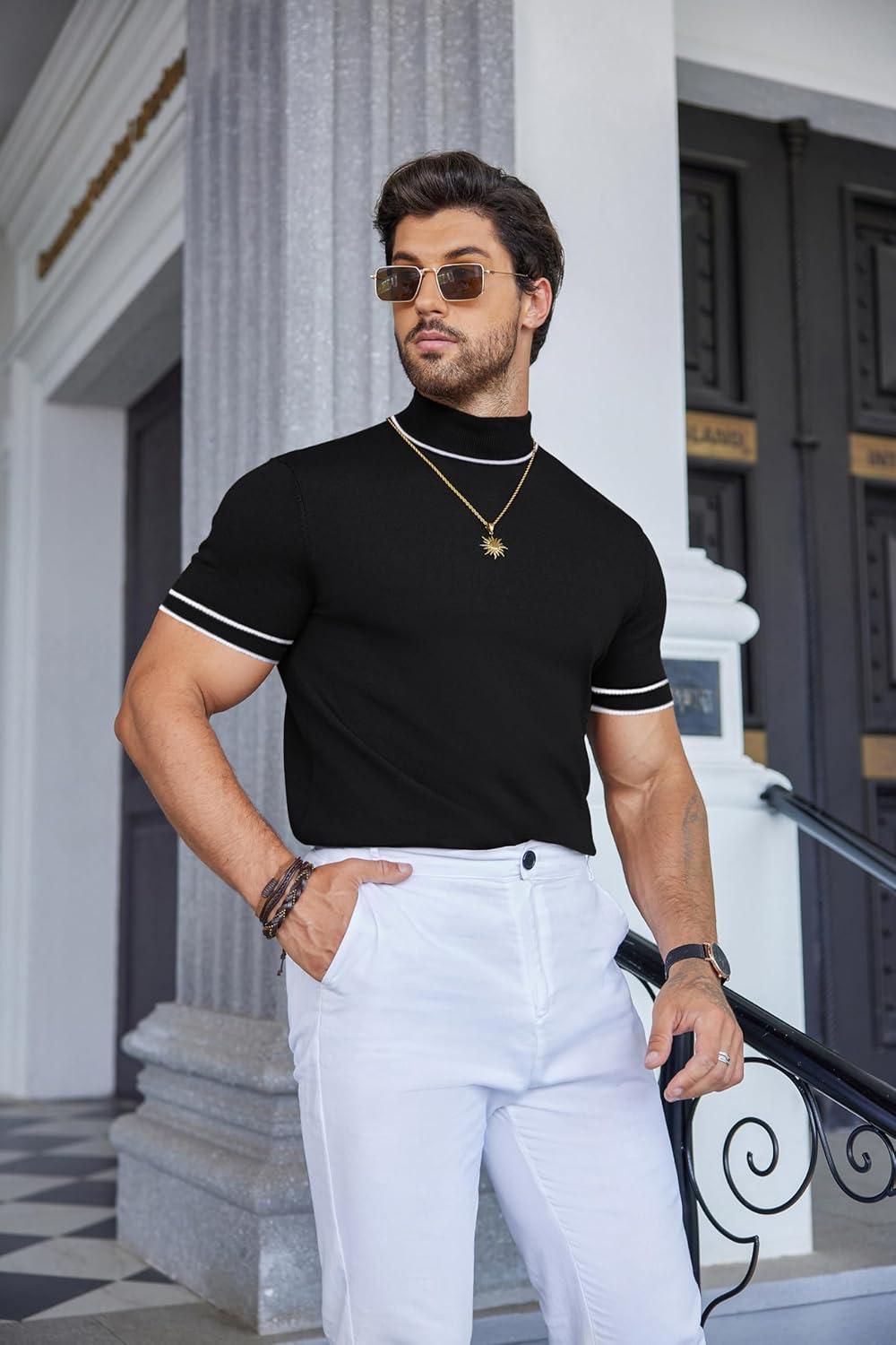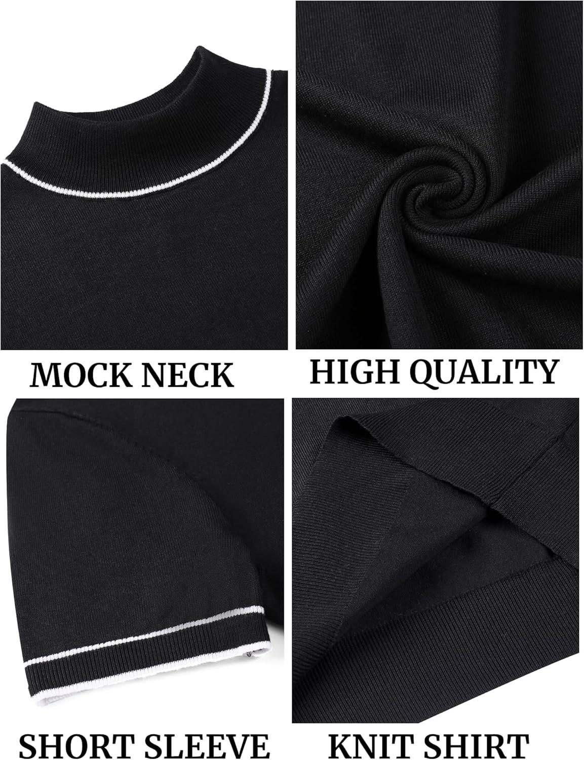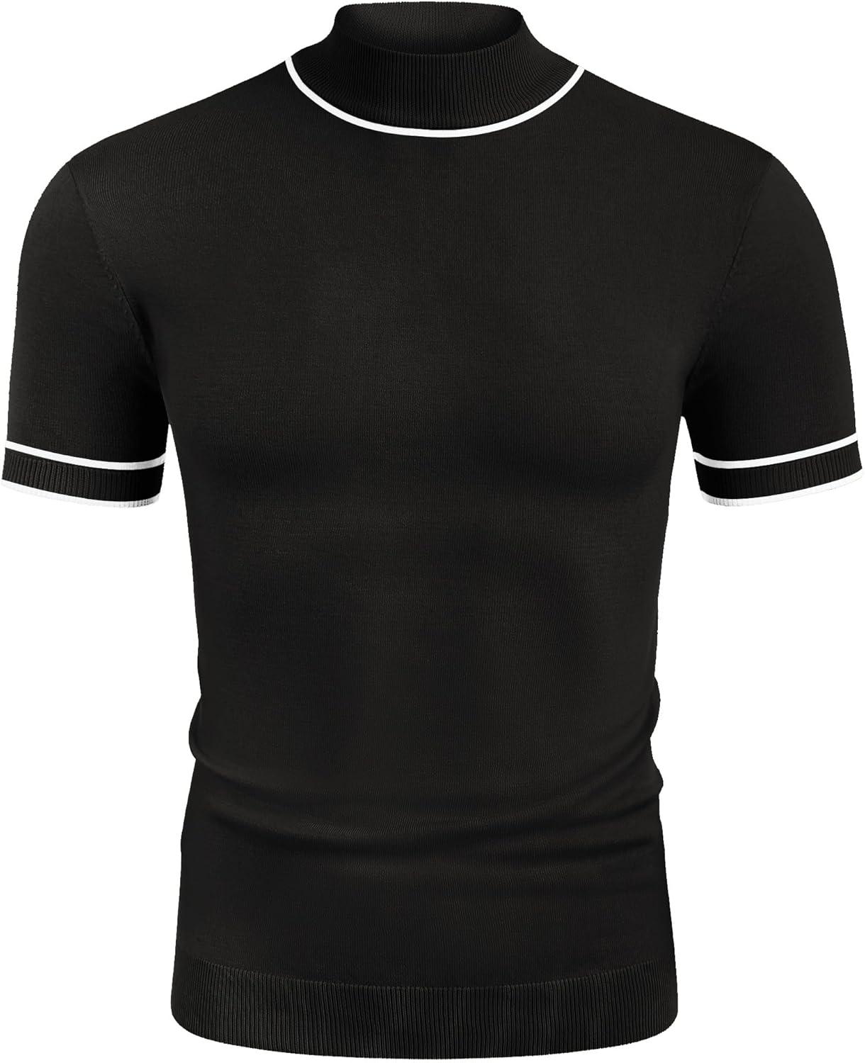 COOFANDY Mens Mock Turtleneck Sweater Short Sleeve Casual Dress Sweater Slim Fit Pullover Basic Knit Tee(Striped Black)