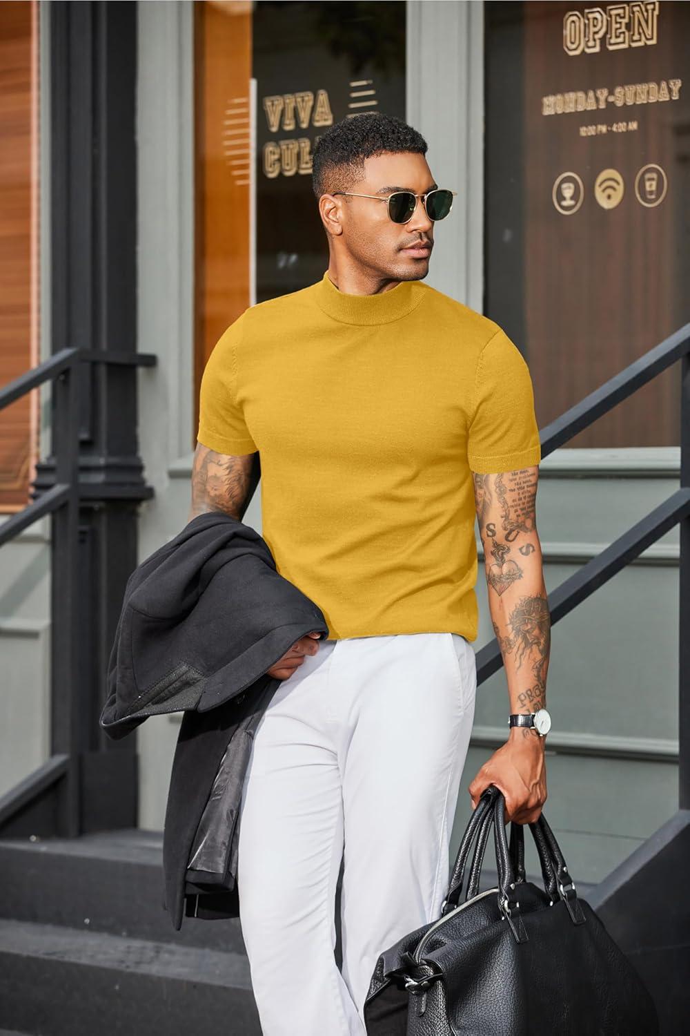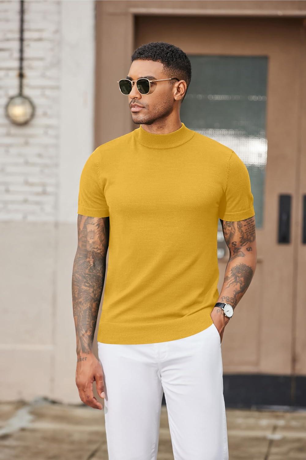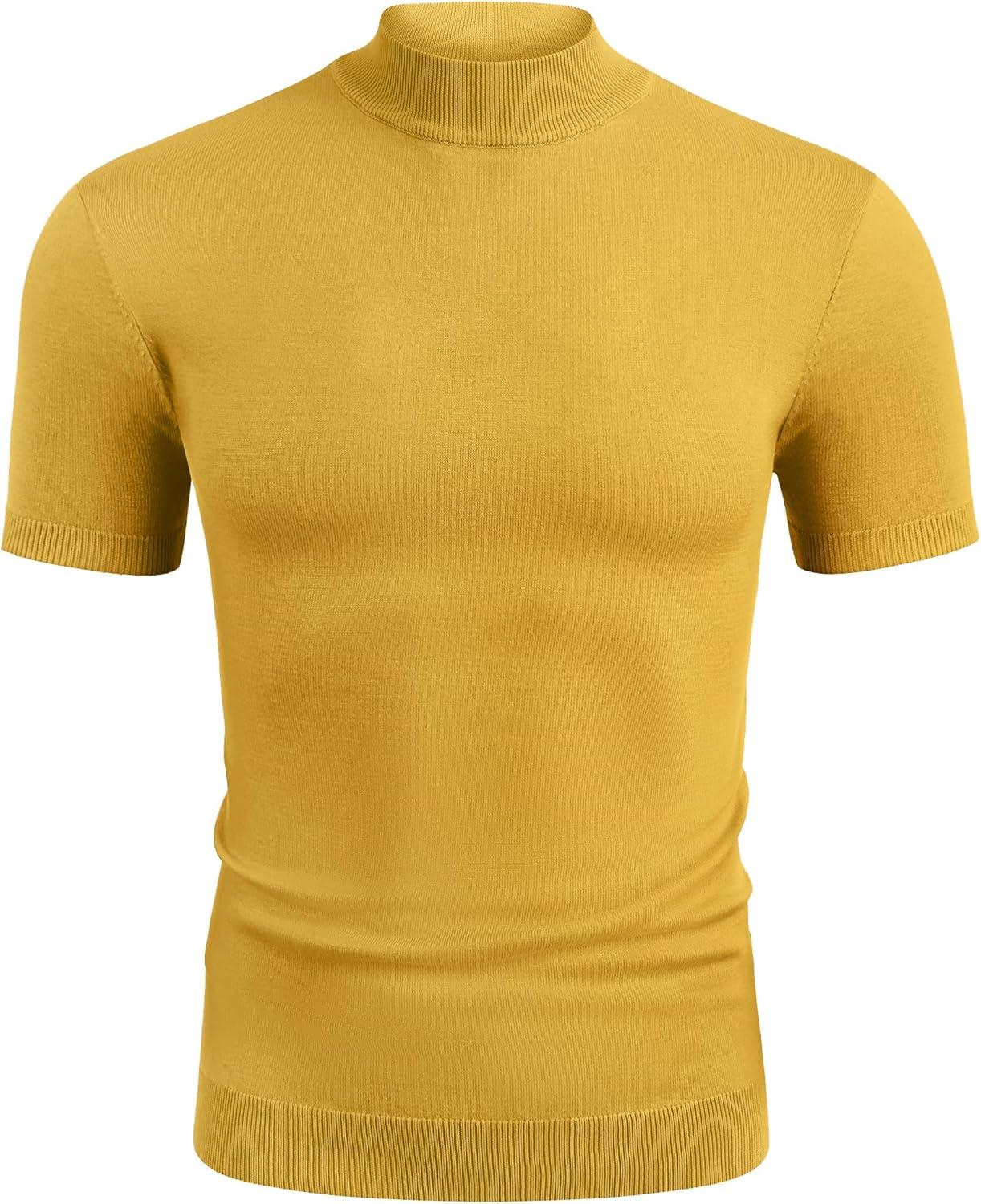 COOFANDY Mens Mock Turtleneck Sweater Short Sleeve Casual Dress Sweater Slim Fit Pullover Basic Knit Tee(Yellow)