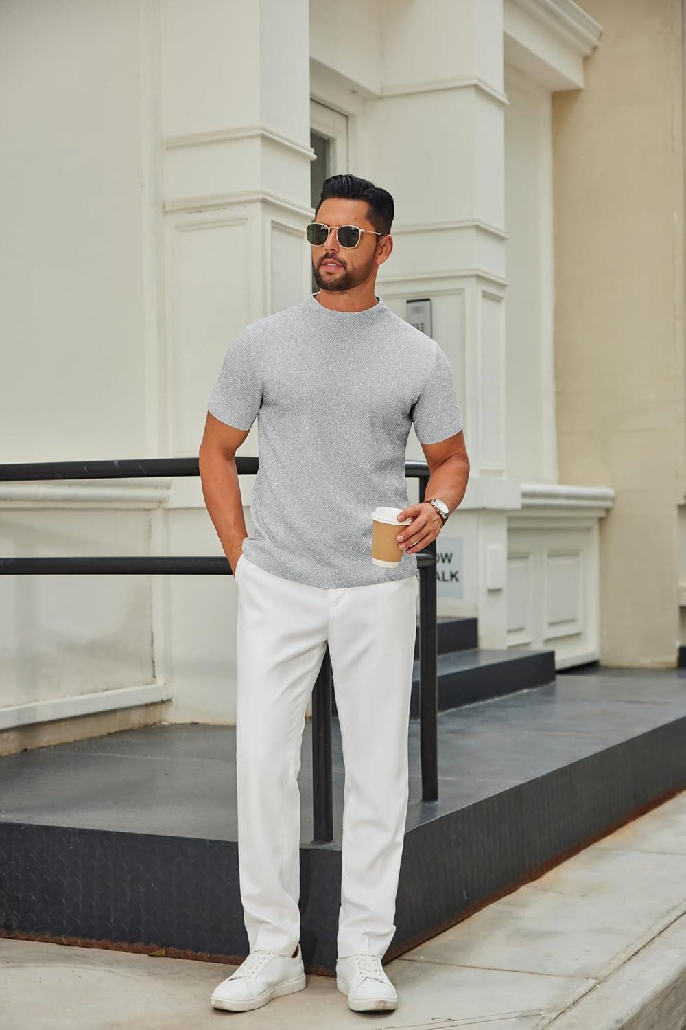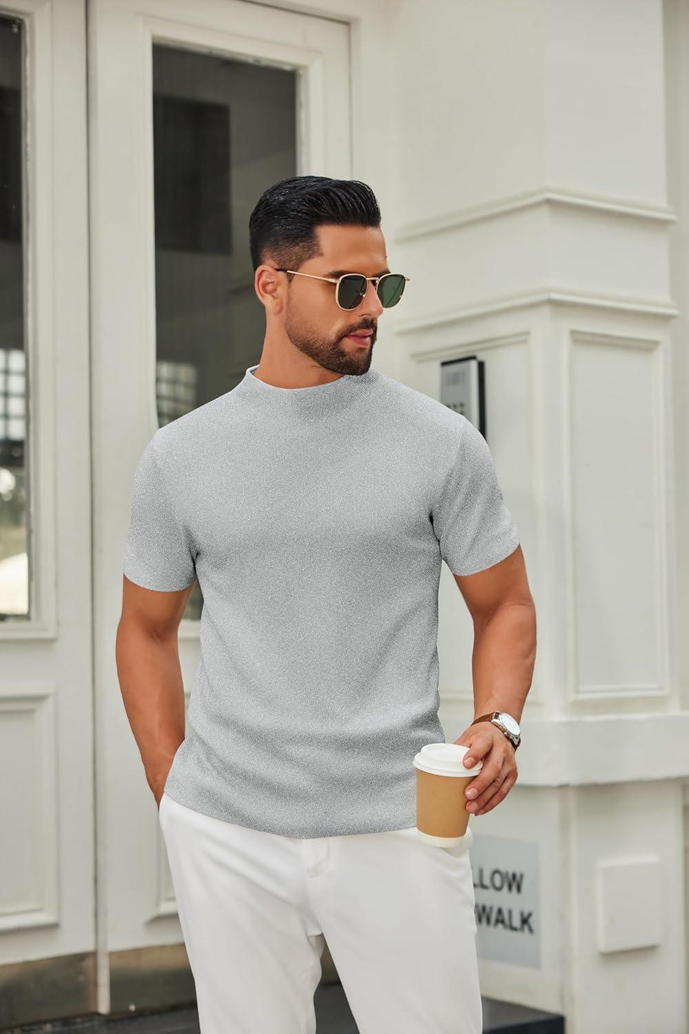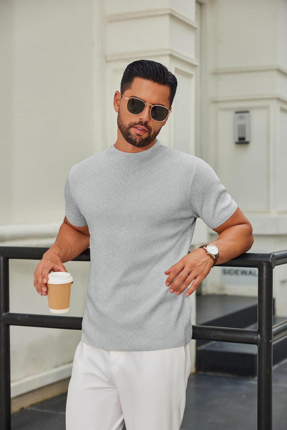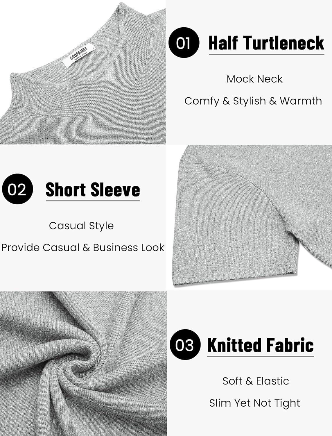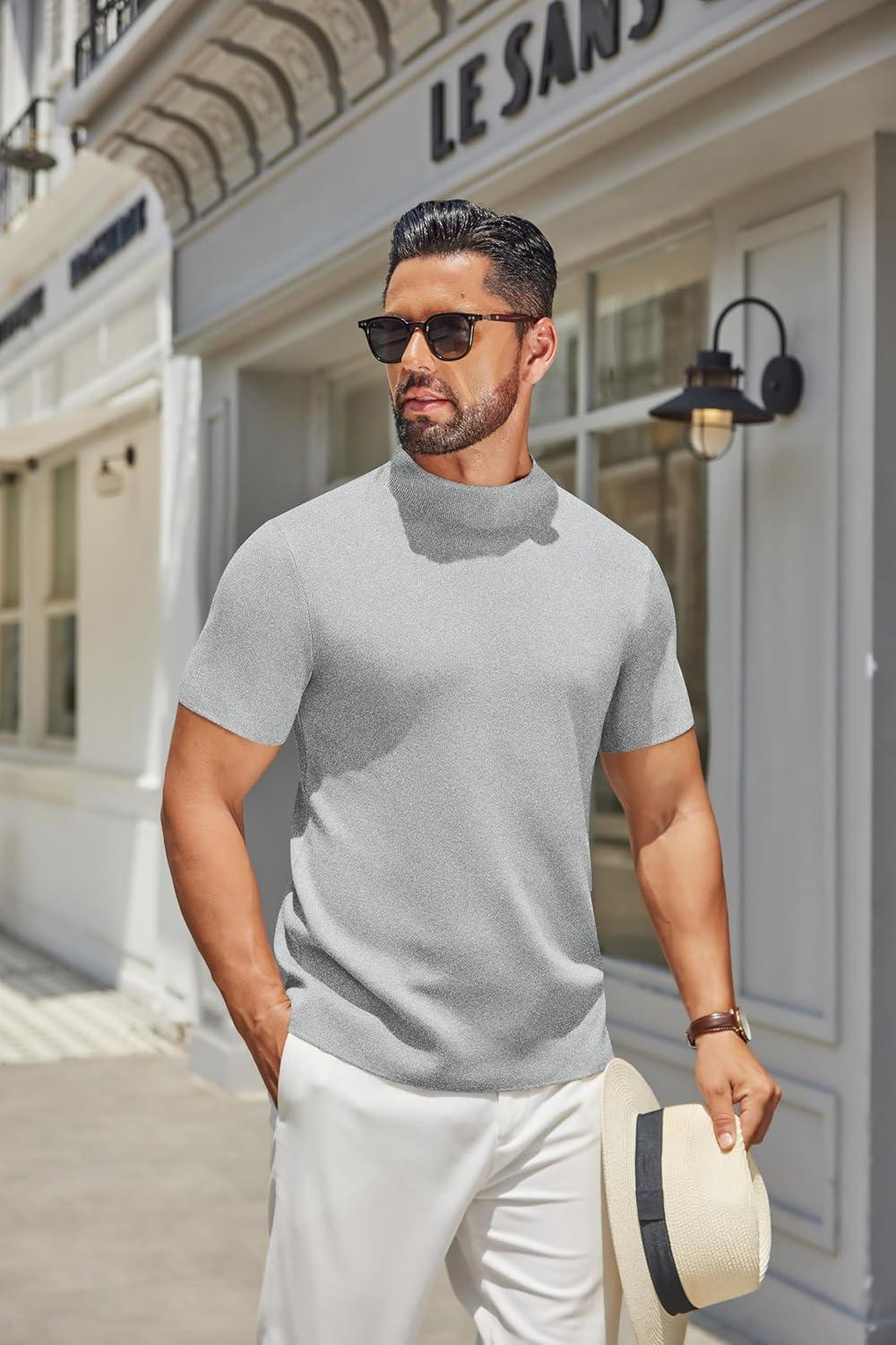 COOFANDY Men’s Mock Turtleneck Sweater Short Sleeve Casual Knitted T-Shirts Thermal Tops Solid Basic Tee(Light Grey)