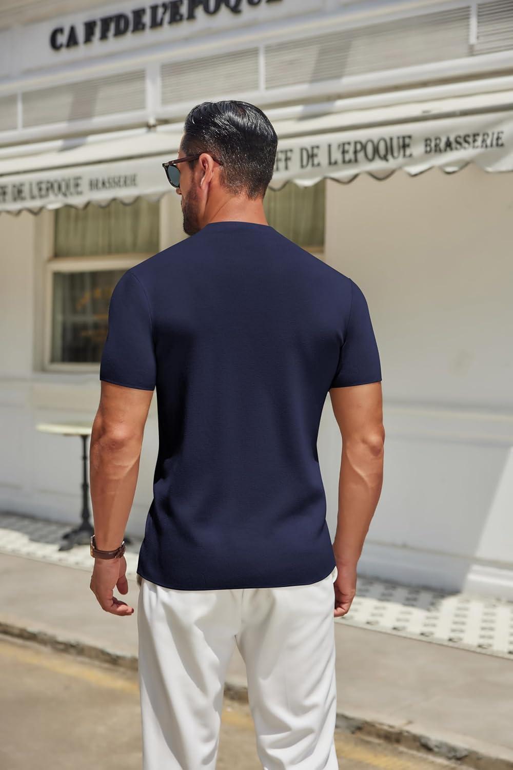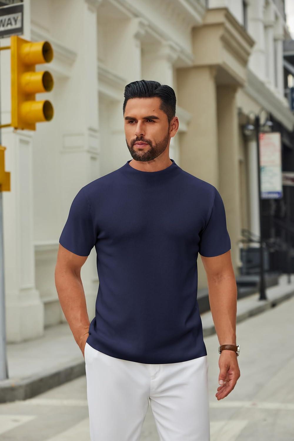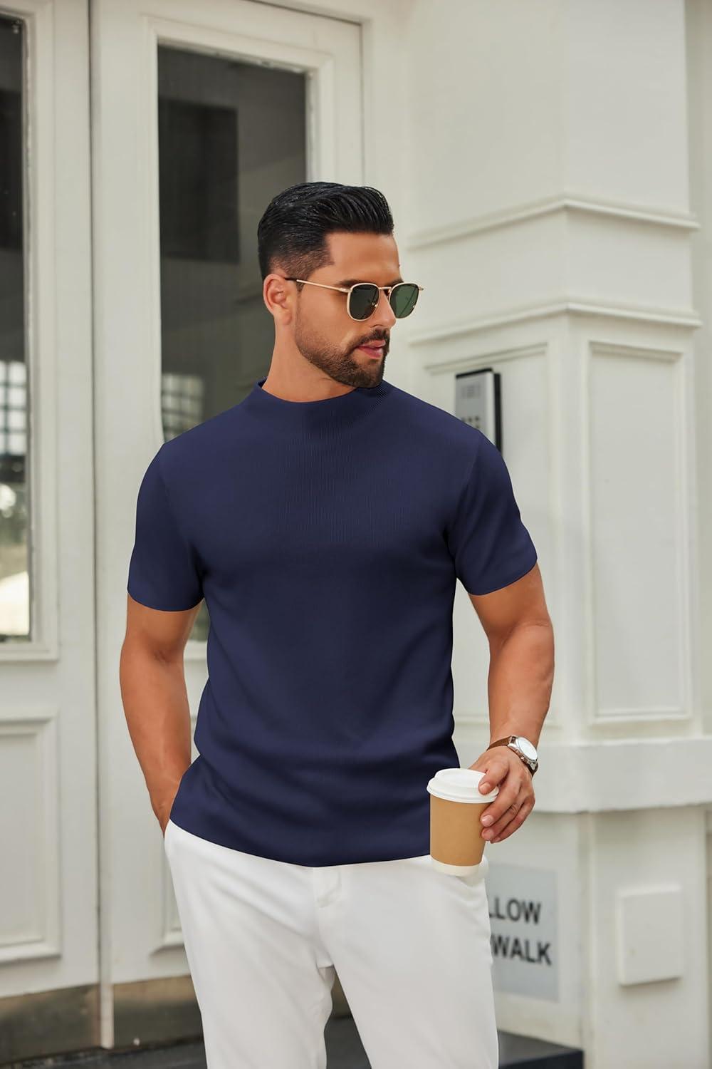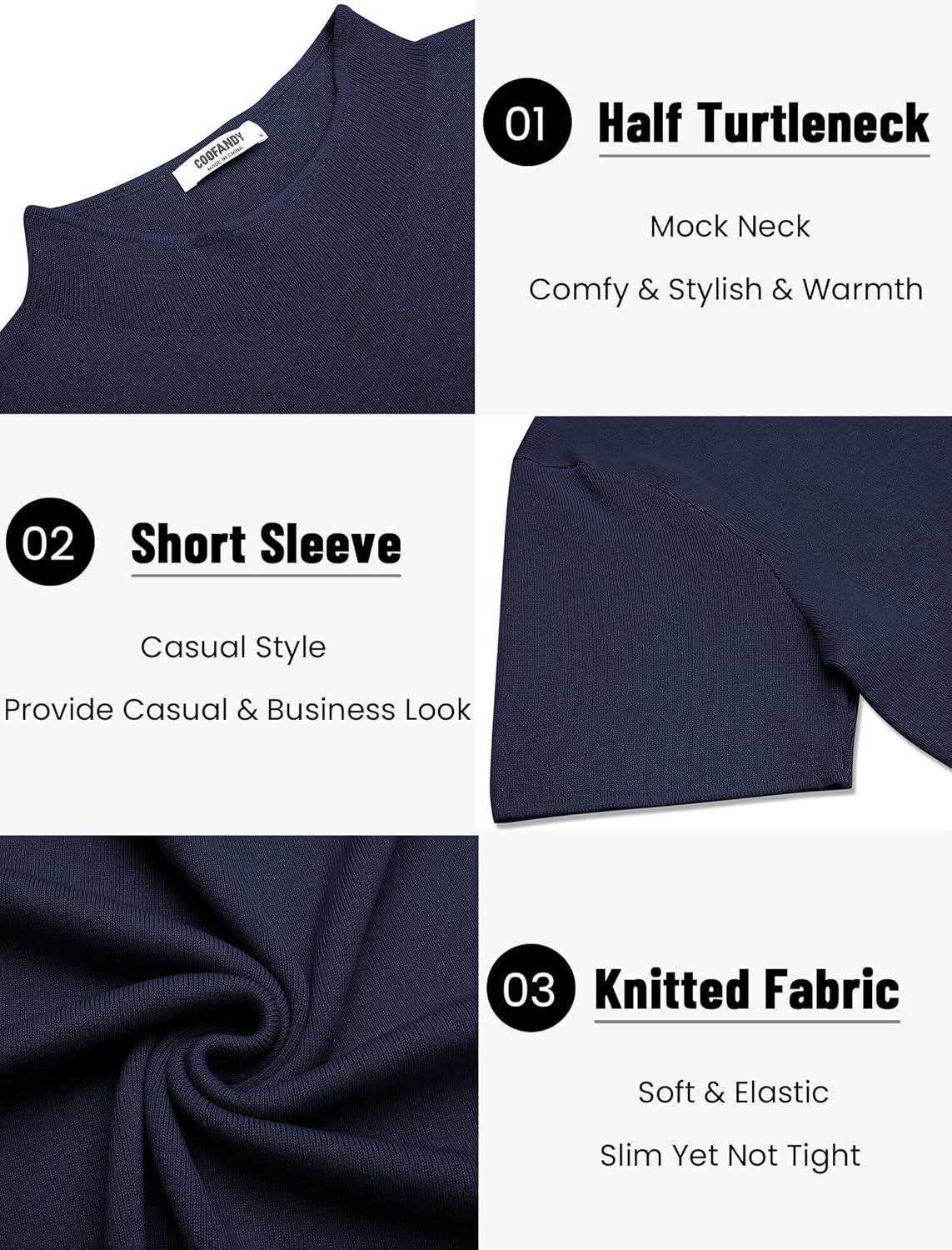 COOFANDY Men’s Mock Turtleneck Sweater Short Sleeve Casual Knitted T-Shirts Thermal Tops Solid Basic Tee(Navy Blue)