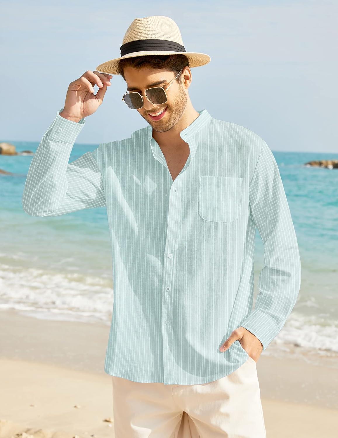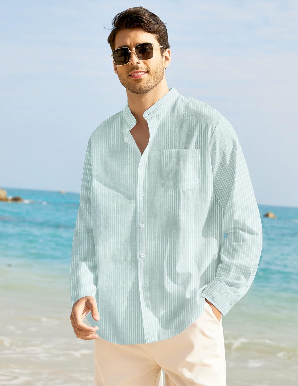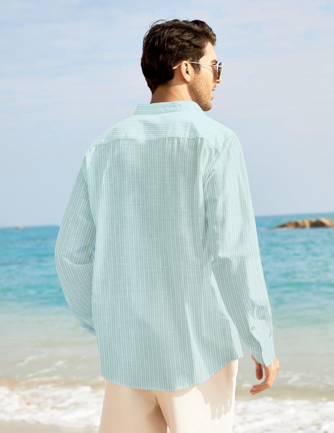 COOFANDY Men’s Oxford Shirts Long Sleeve Casual Button Down Shirts Band Collar Dress Shirt with Pocket(1-green Striped)