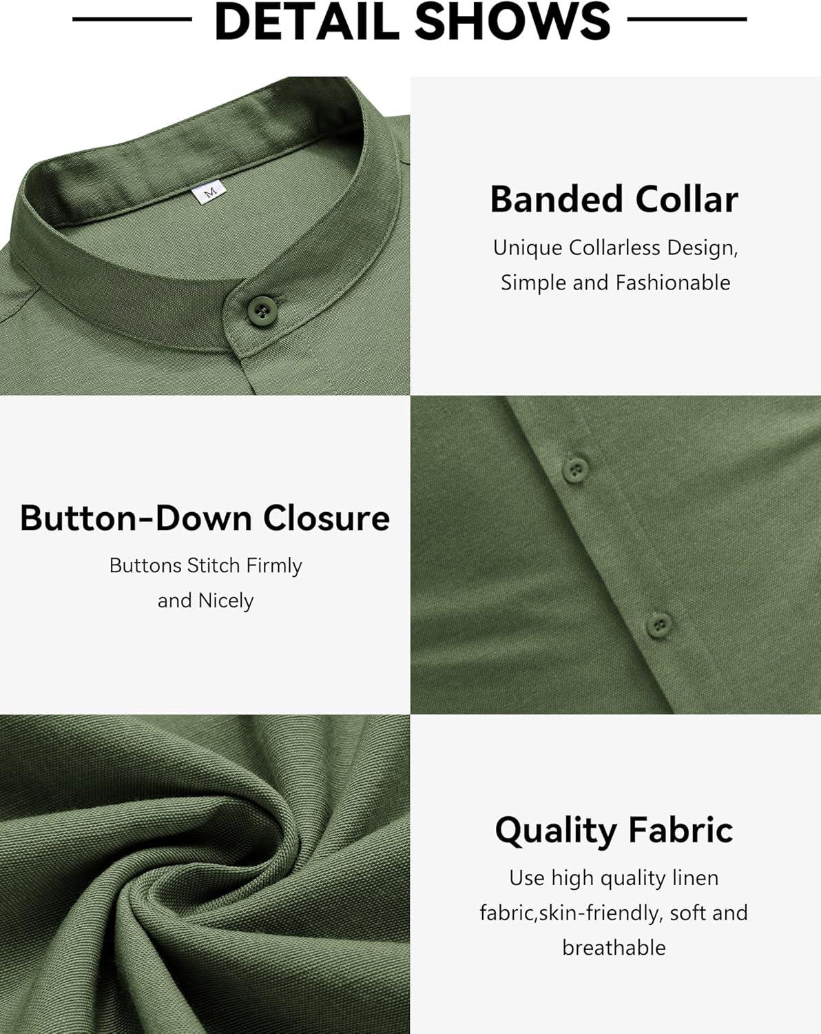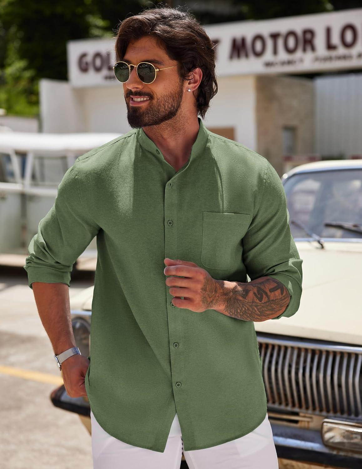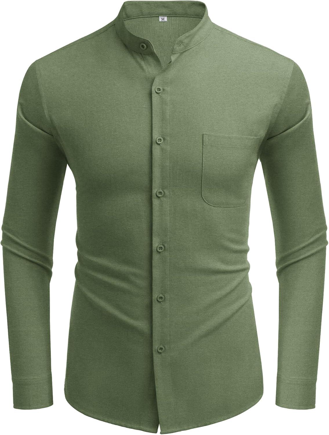 COOFANDY Men’s Oxford Shirts Long Sleeve Casual Button Down Shirts Band Collar Dress Shirt with Pocket(Army Green)