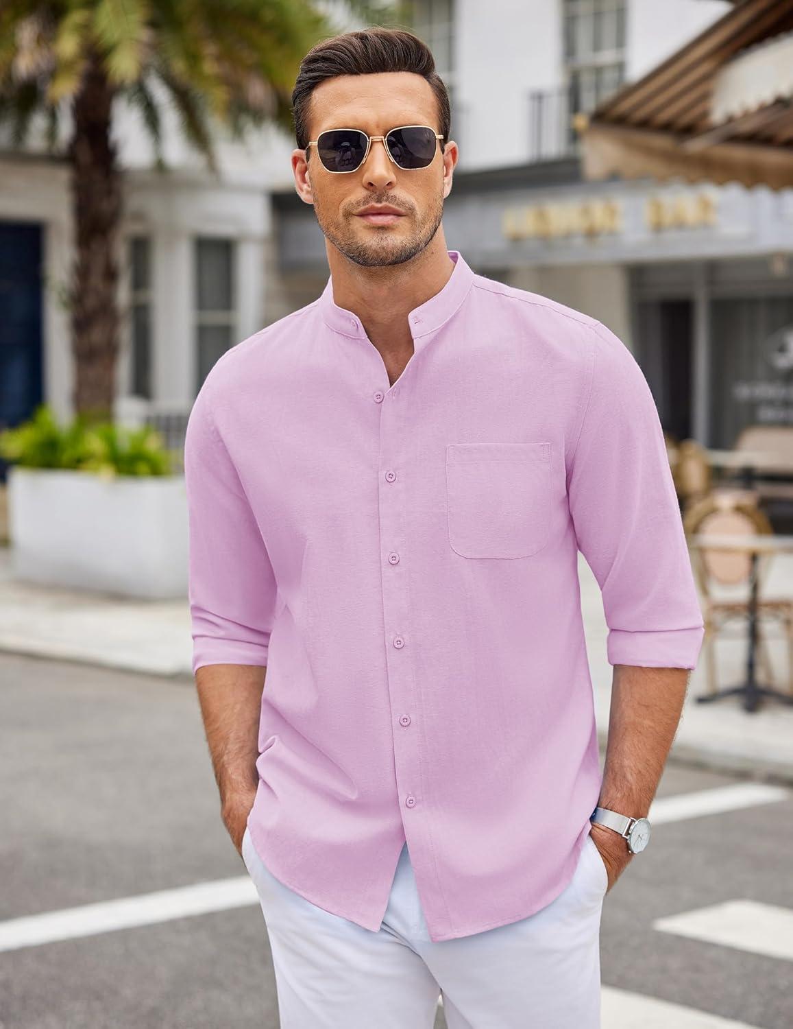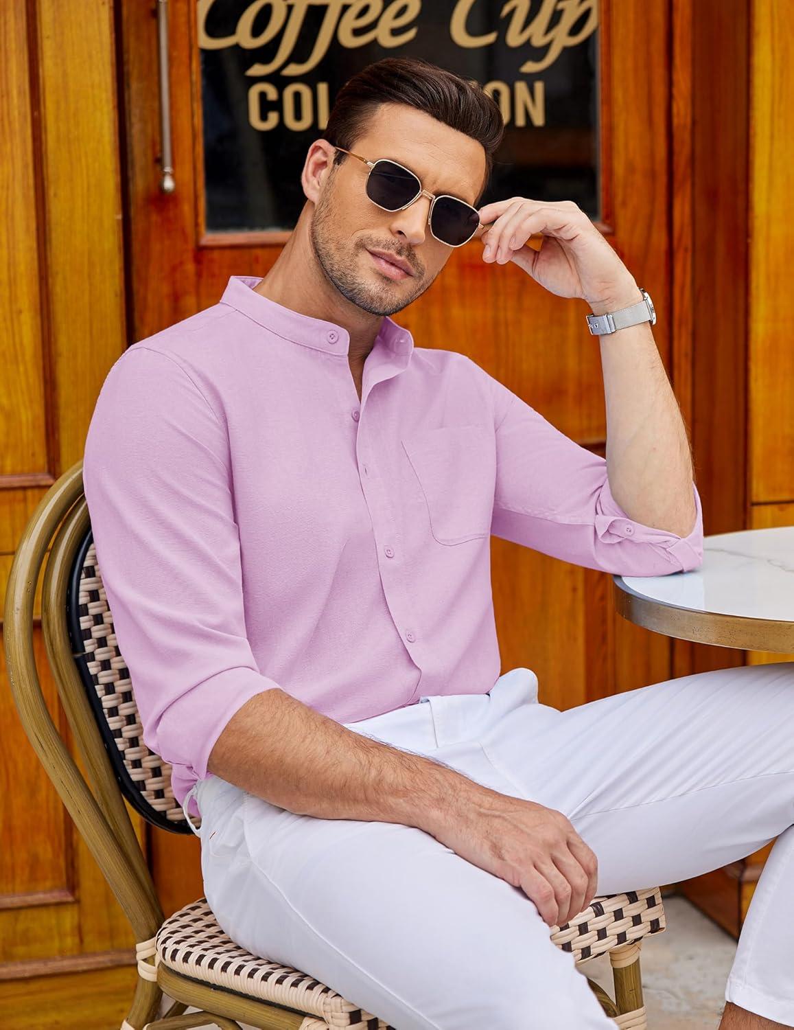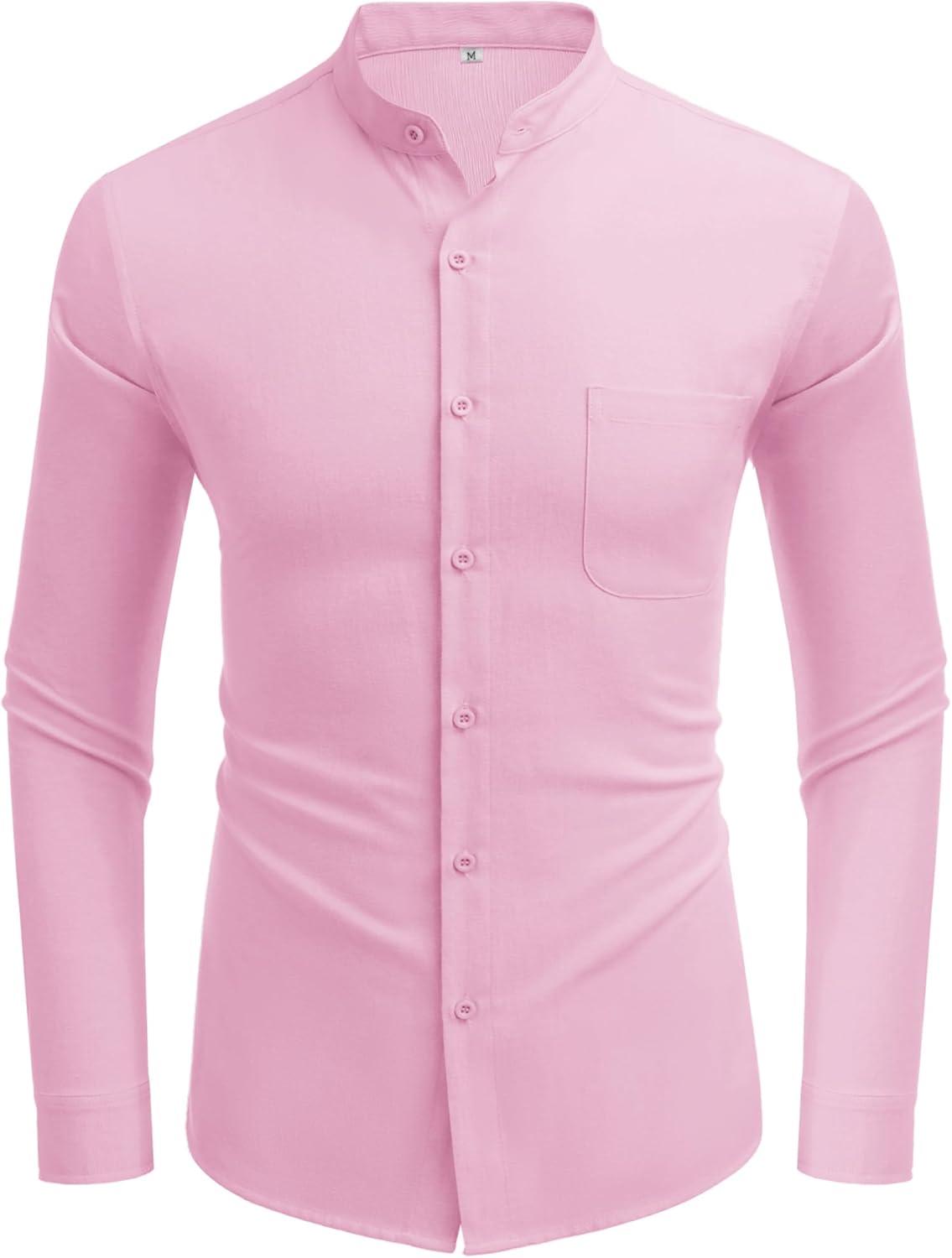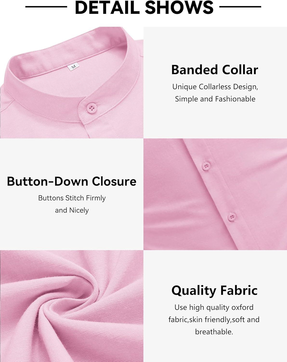 COOFANDY Men’s Oxford Shirts Long Sleeve Casual Button Down Shirts Band Collar Dress Shirt with Pocket(Pink)