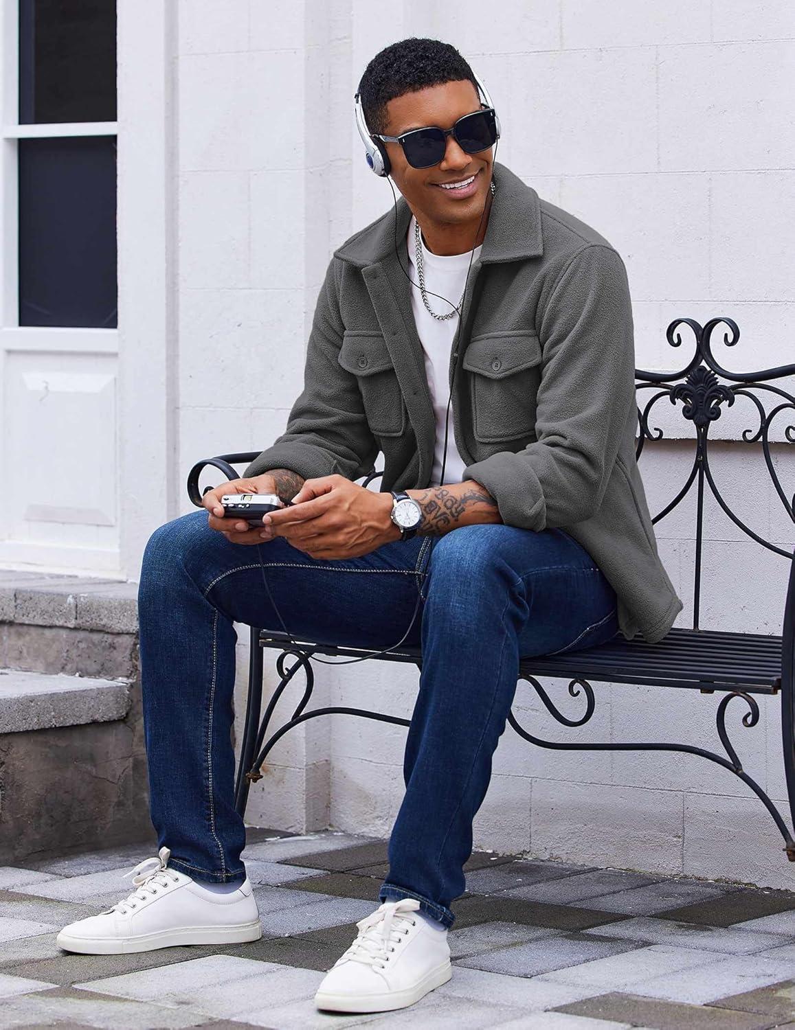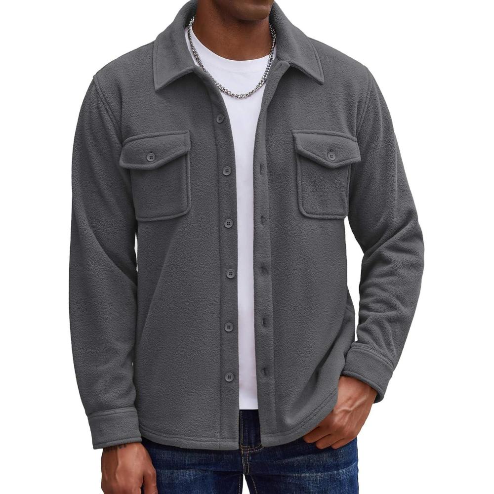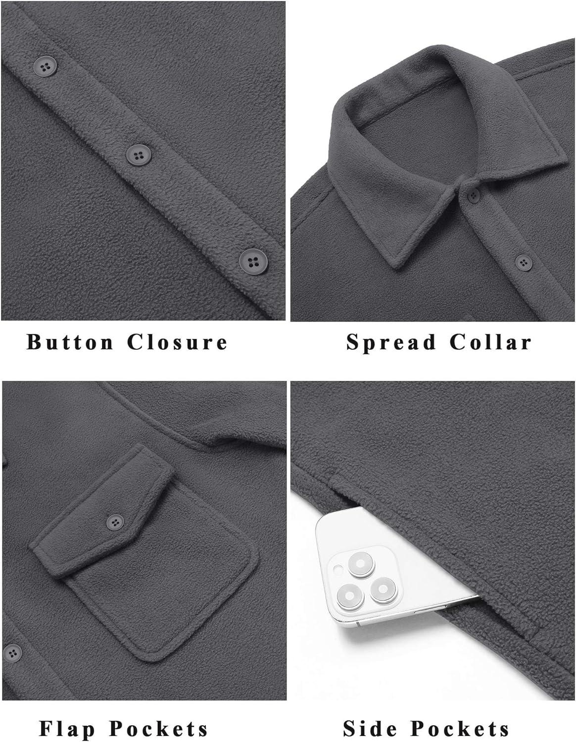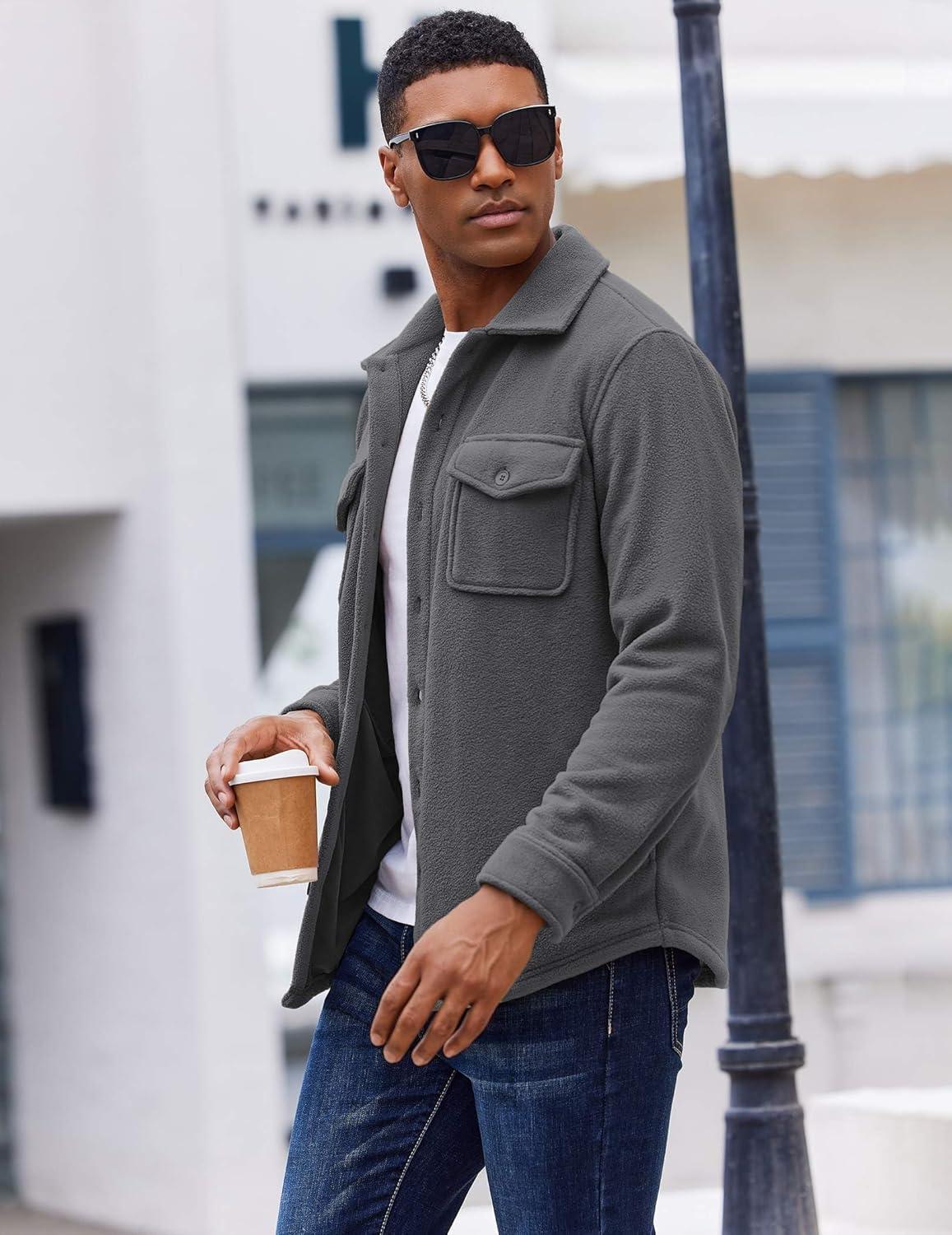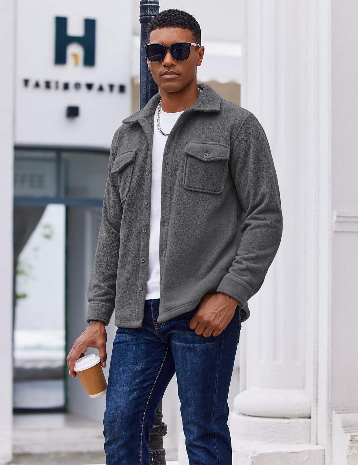 COOFANDY Men’s Polar Fleece Shirt Jacket Long Sleeve Casual Button Down Shirts Shacket with Pockets(Gray)