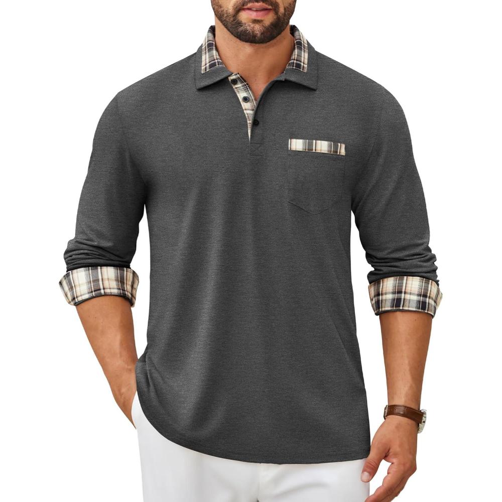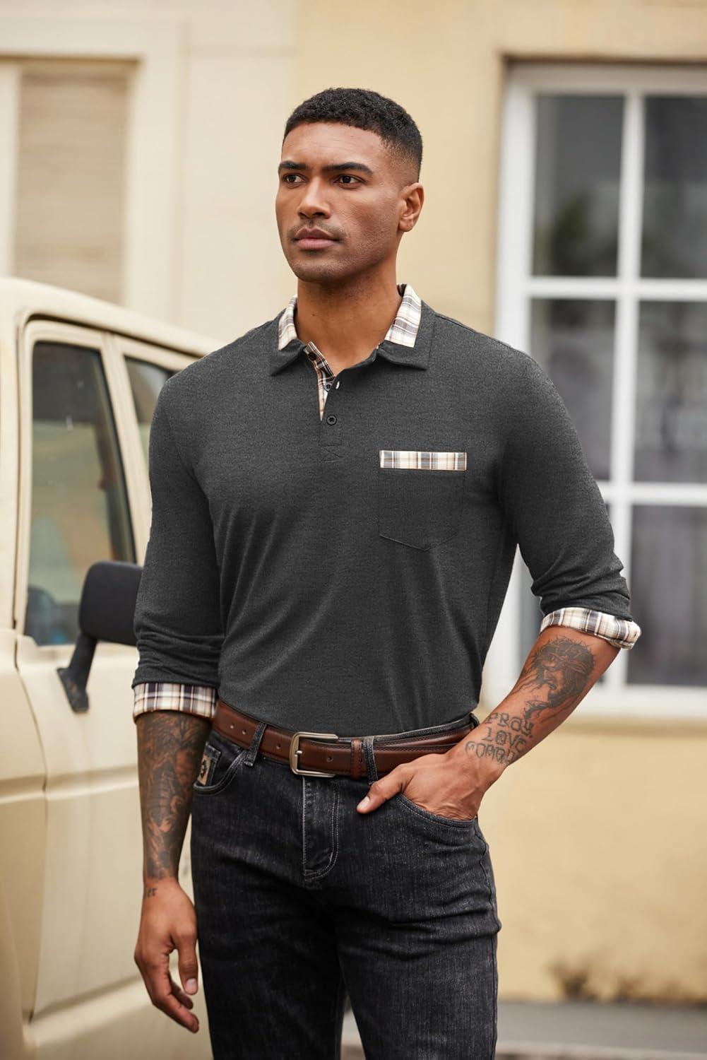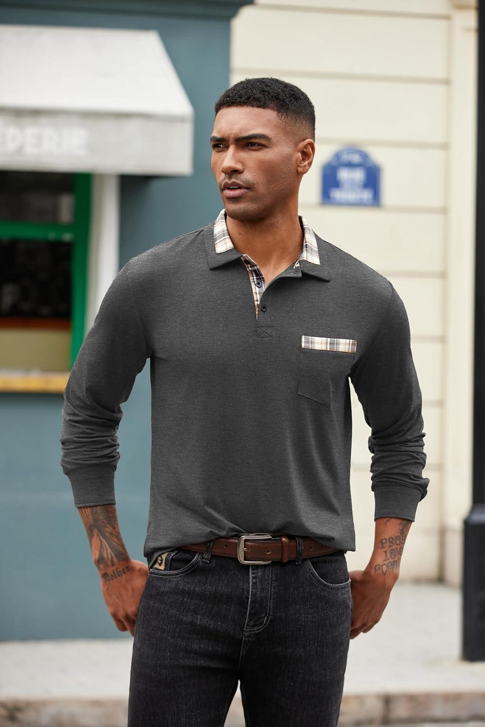 COOFANDY Men’s Polo Shirt Long Sleeve Casual Button Polo Tee Plaid Collared Golg Shirt with Pocket(Charcoal Grey)