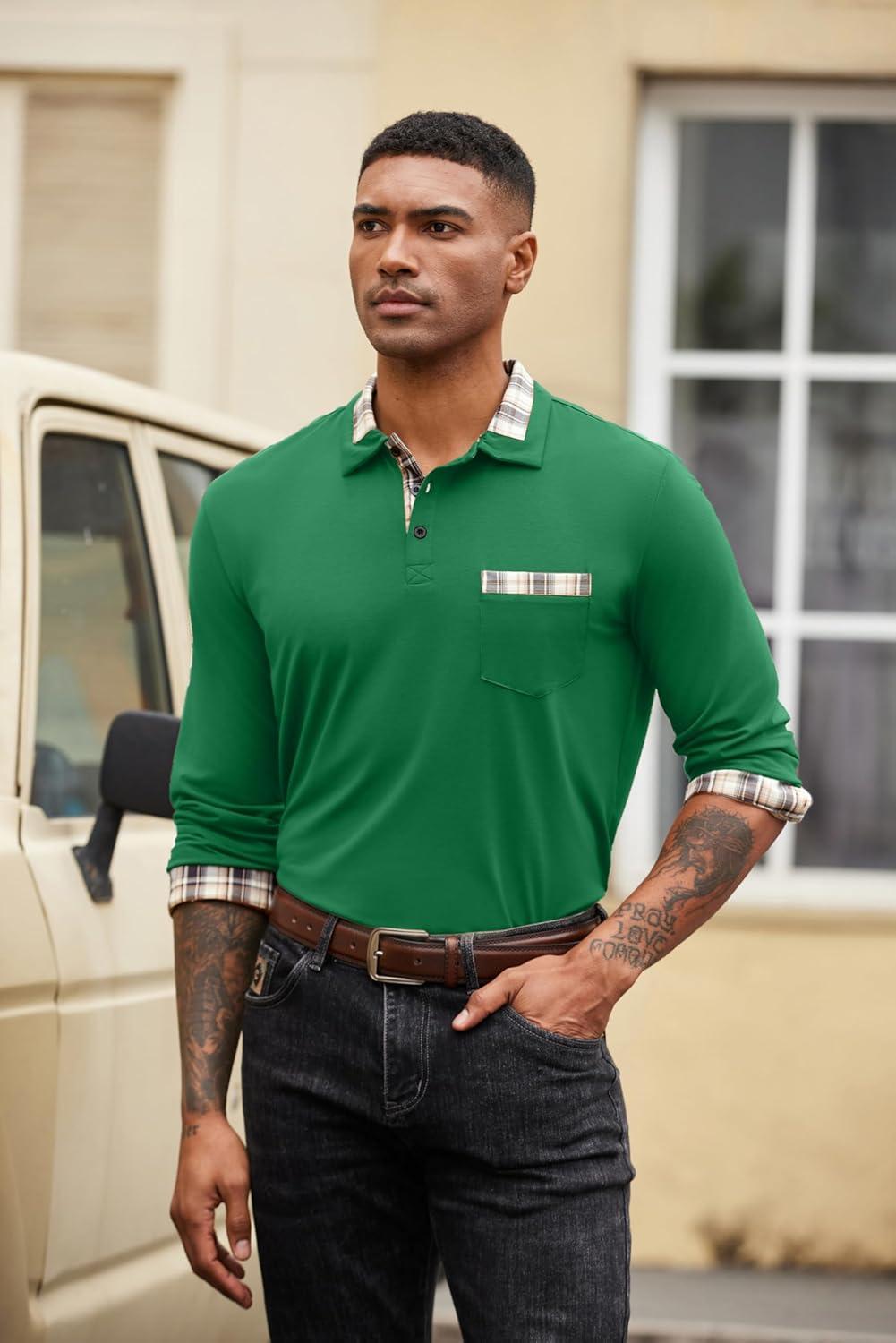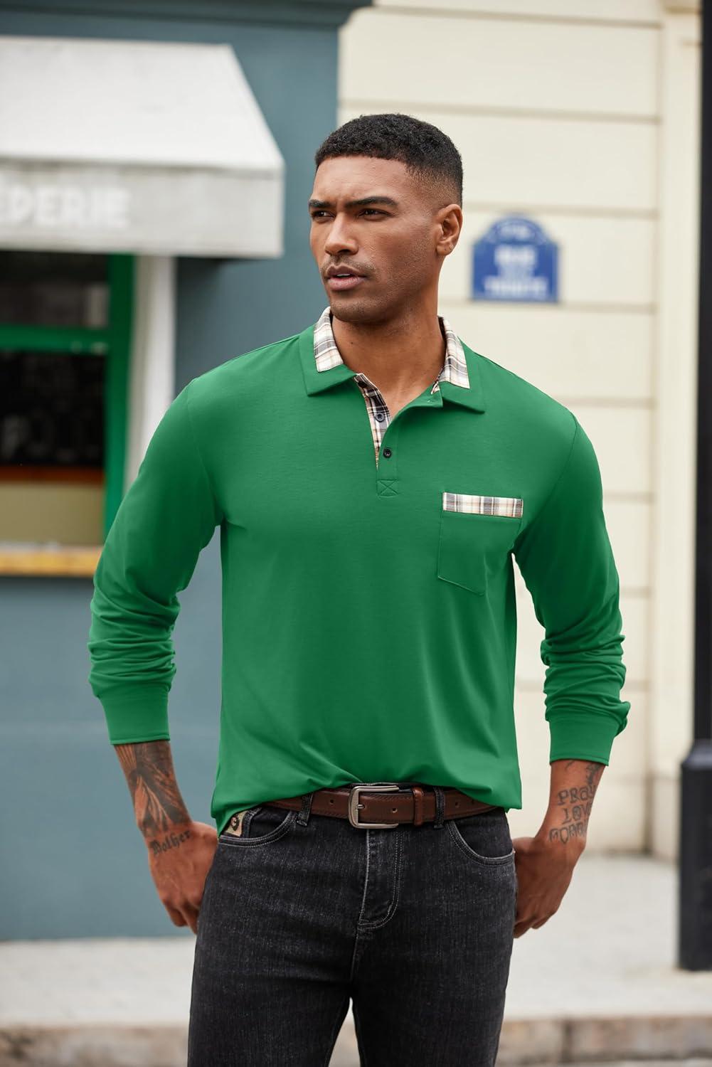 COOFANDY Men’s Polo Shirt Long Sleeve Casual Button Polo Tee Plaid Collared Golg Shirt with Pocket(Green)