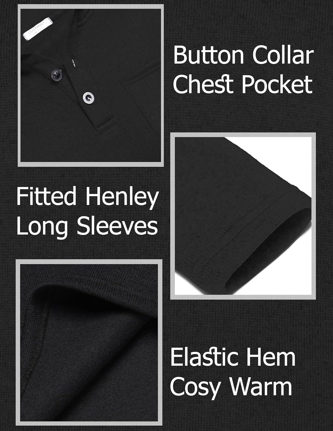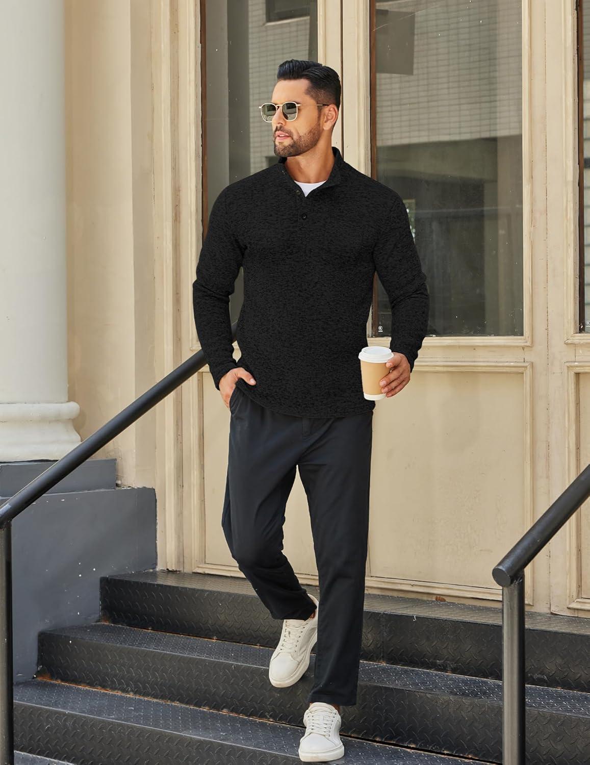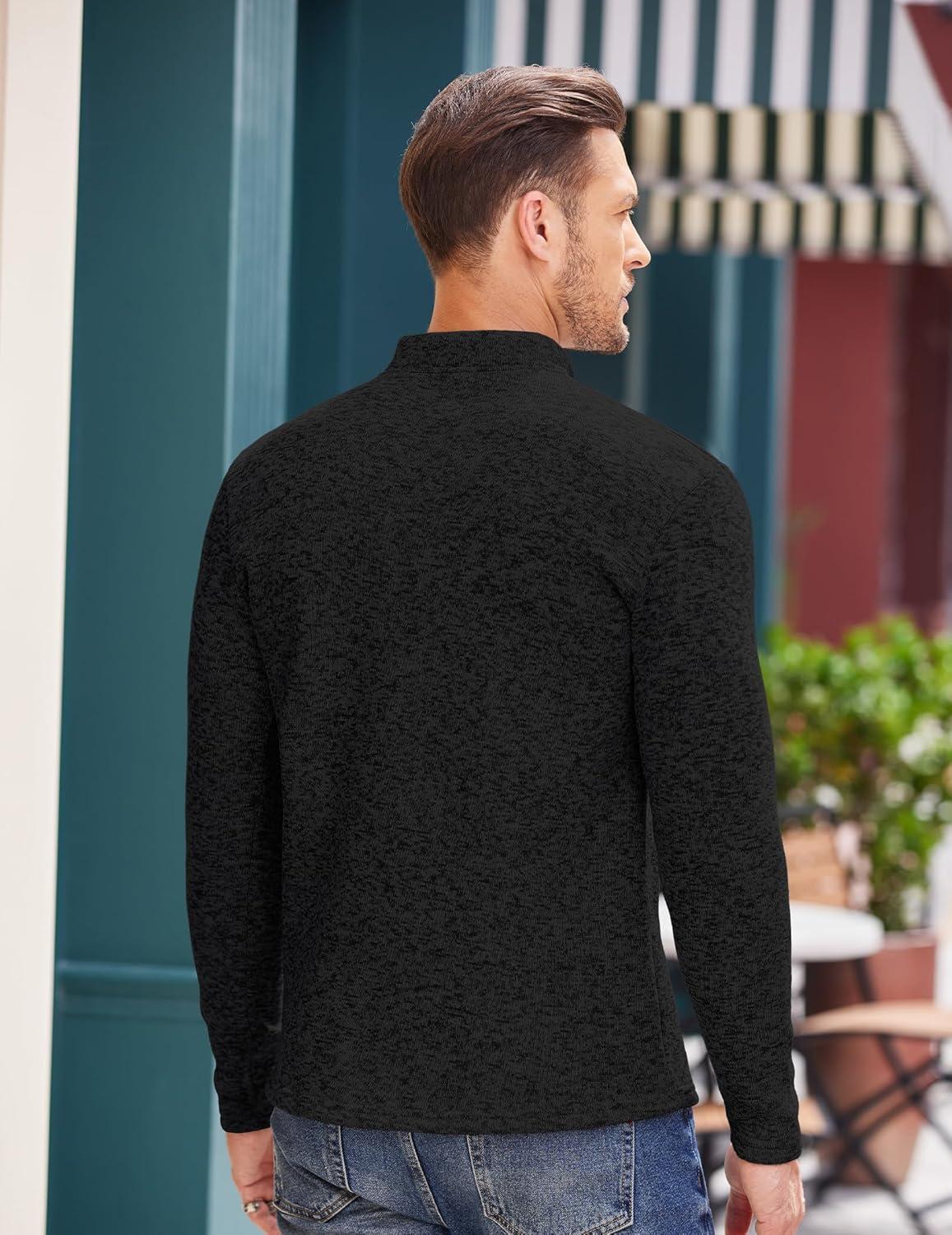 COOFANDY Men’s Quarter Button Henley Sweater Casual Knitted Sweatshirt Mock Neck Thermal Fleece Pullover Sweater with Pocket(Black)