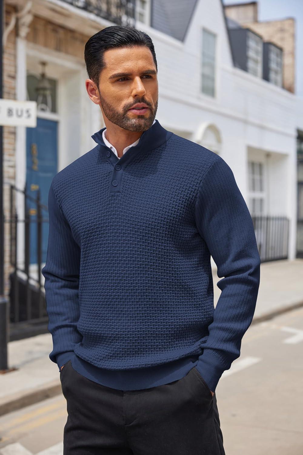 COOFANDY Men’s Quarter Button Sweater Lightweight Mock Neck Pullover Sweater Fashion Casual Knitted Waffle Henley Sweater(Navy Blue)